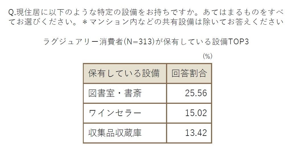 「ラグジュアリー消費者」は、主に生活拠点としている住居において、「図書室・書斎」「ワインセラー」「収集品収蔵庫」「美術・芸術品ギャラリー」「ジム」など趣味・文化・健康維持設備を所有する傾向があり、今後購入予定の家具・インテリア商品の1位は「絵画・アート作品」(31.6%)でした。「ラグジュアリー消費者は、必ずしも金銭的なリターンを生むものではなくても、長期にわたって自分自身や家族に対して便益や体験を与えてくれるものに積極的にお金をつかっていく『投資的消費』に積極的である傾向がみてとれます。」(MD社代表・石井 賢介氏)