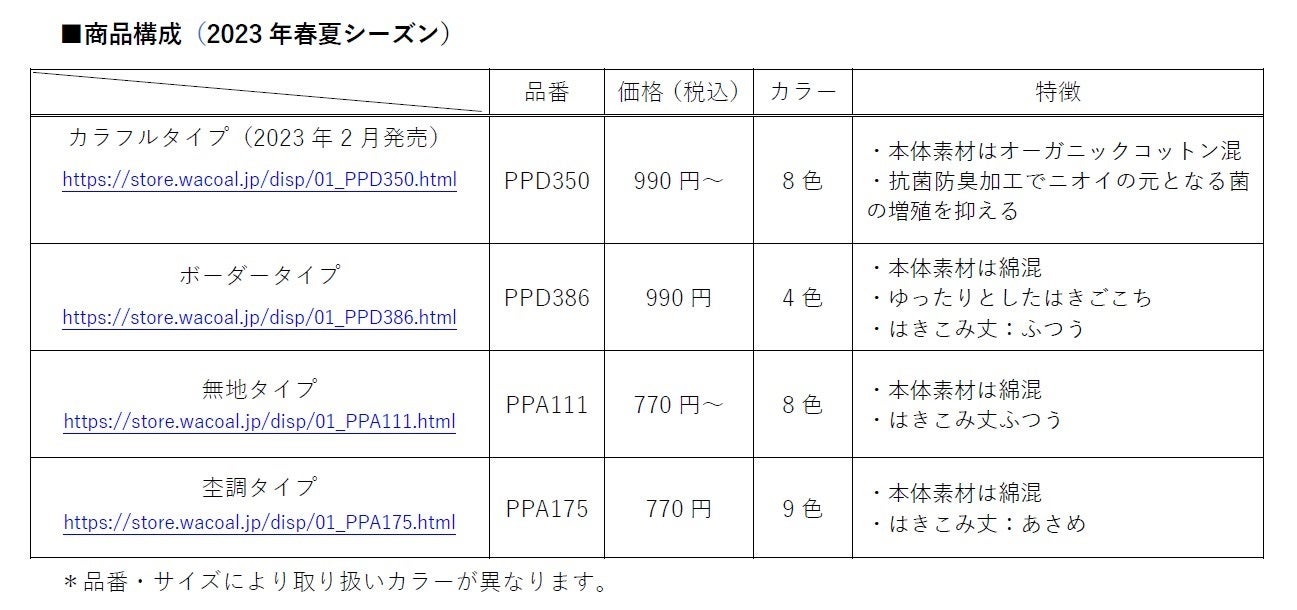 誕生から50周年を迎える2023年春夏シーズンは、オーガニックコットン使用の新シリーズを加え、定番のタイプと合わせて計29種の豊富なカラーバリエーションで展開。全国の百貨店、下着専門店、チェーンストア(量販店)、ワコールウェブストア等のECで発売し、2023年2月~6月で90万枚の売上を目指します。