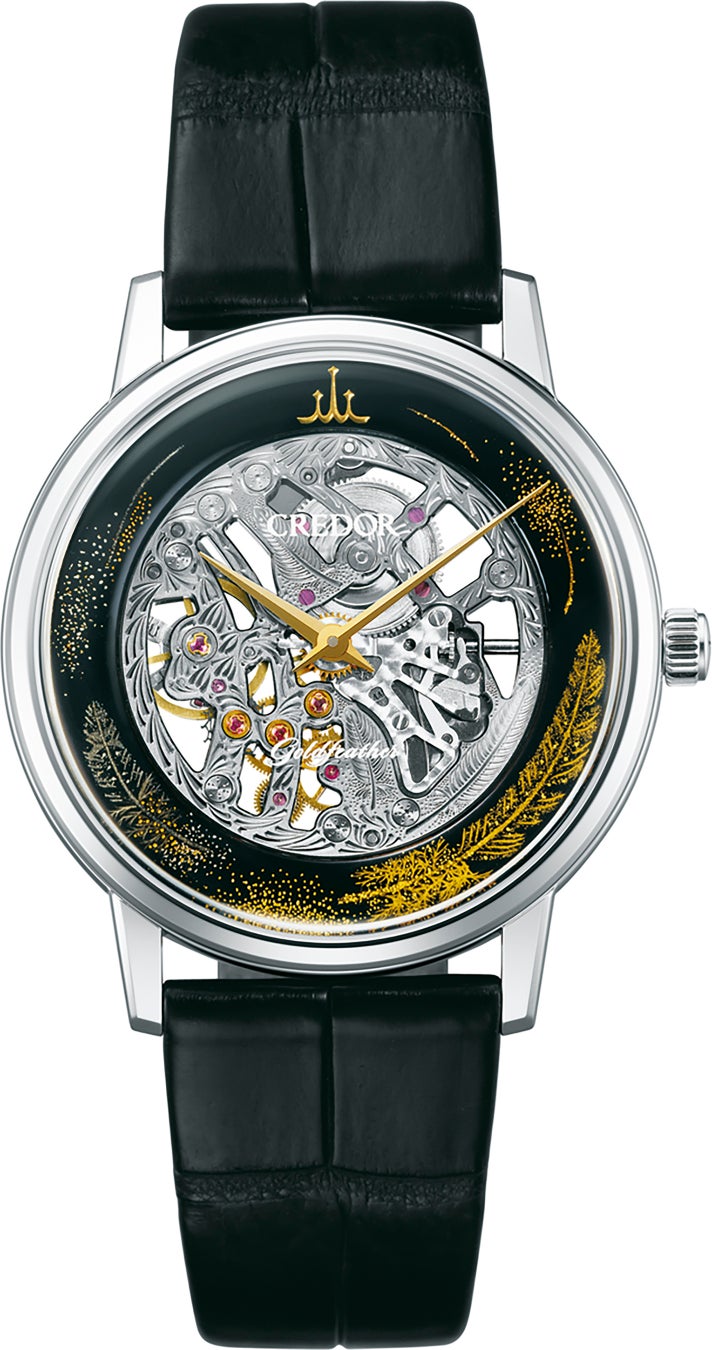 加賀蒔絵の達人である田村一舟氏による漆芸と、クレドールの彫金工房が培ってきた彫金技法を、高い次元で融合した今回のモデル。羽根のように軽やかで柔らかなゴールドフェザーのデザインをベースにしながら、風格ある姿が魅力の大鷲をデザインイメージとしました。全体のカラーは、その羽根をモチーフとしており、大鷲の持つ精悍さを、スタイリッシュなルテニウム仕上げの彫金ムーブメントと、漆に蒔絵で描いたプレートを組み合わせて表現しました。
