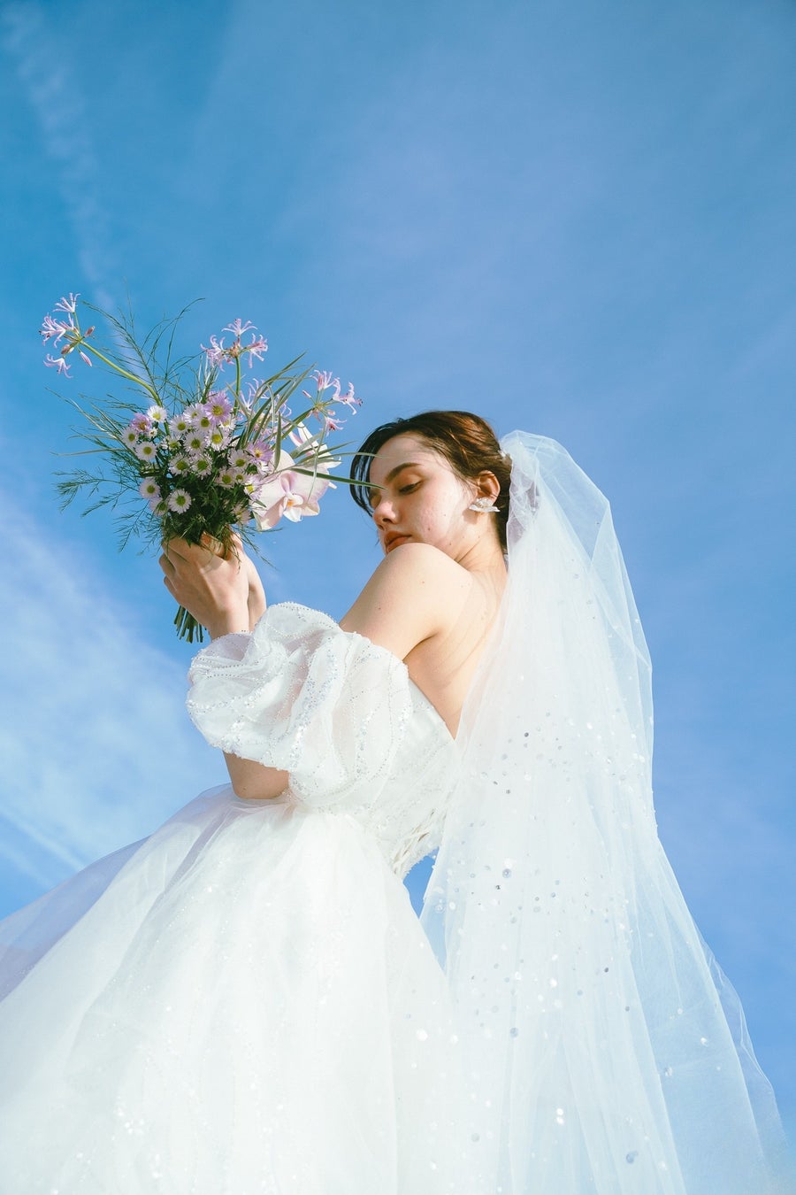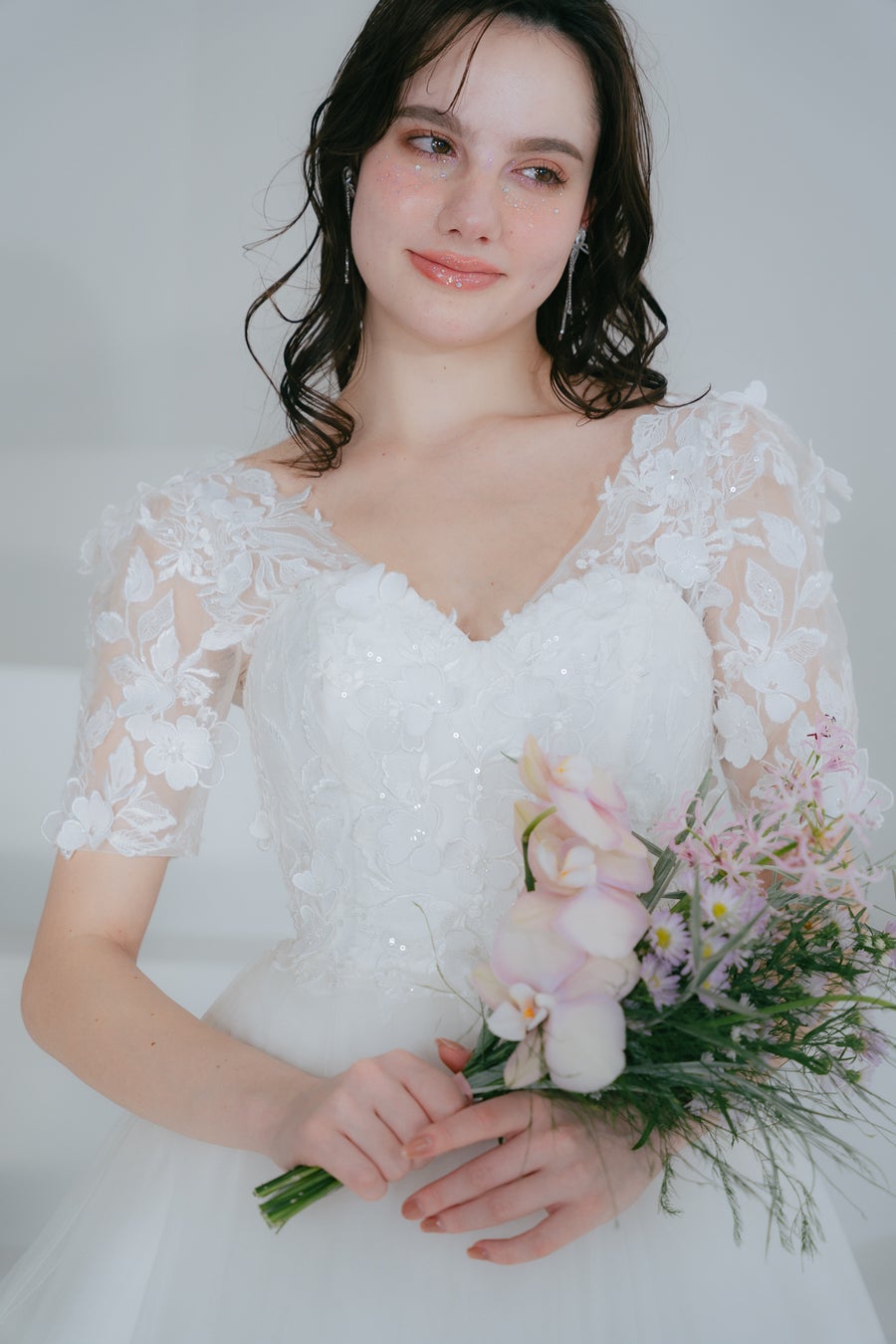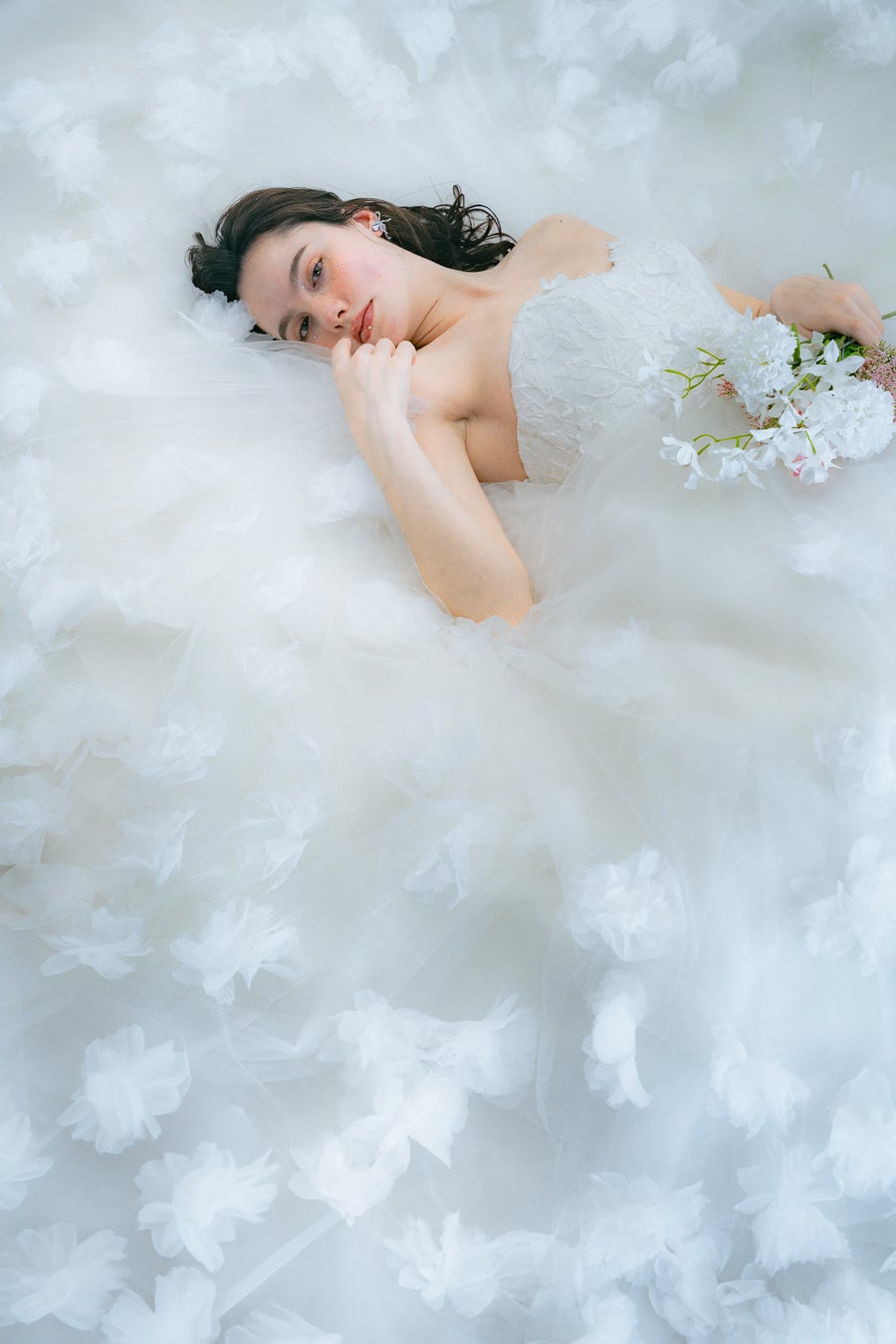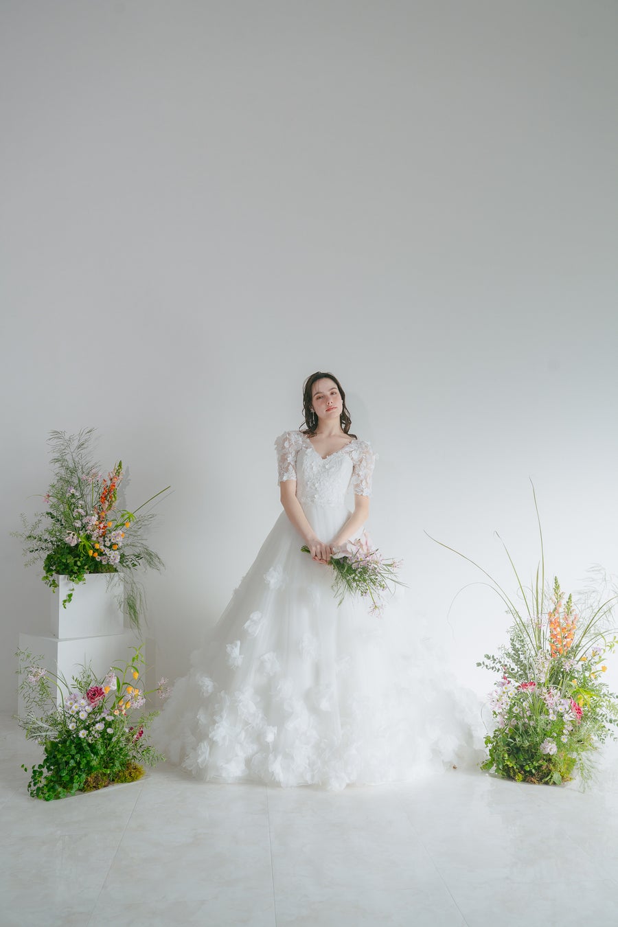 2026年コレクションのRUNWAY PREMIUMとなる「Liora」は、ドレス全体にフラワーモチーフを贅沢に散りばめた華やかさと上品さを両立したAラインドレスです。付属のオーバースカートや、ヨークでイメージを自在に楽しめる “欲張りな一着”は、永遠に愛されるデザイン。
