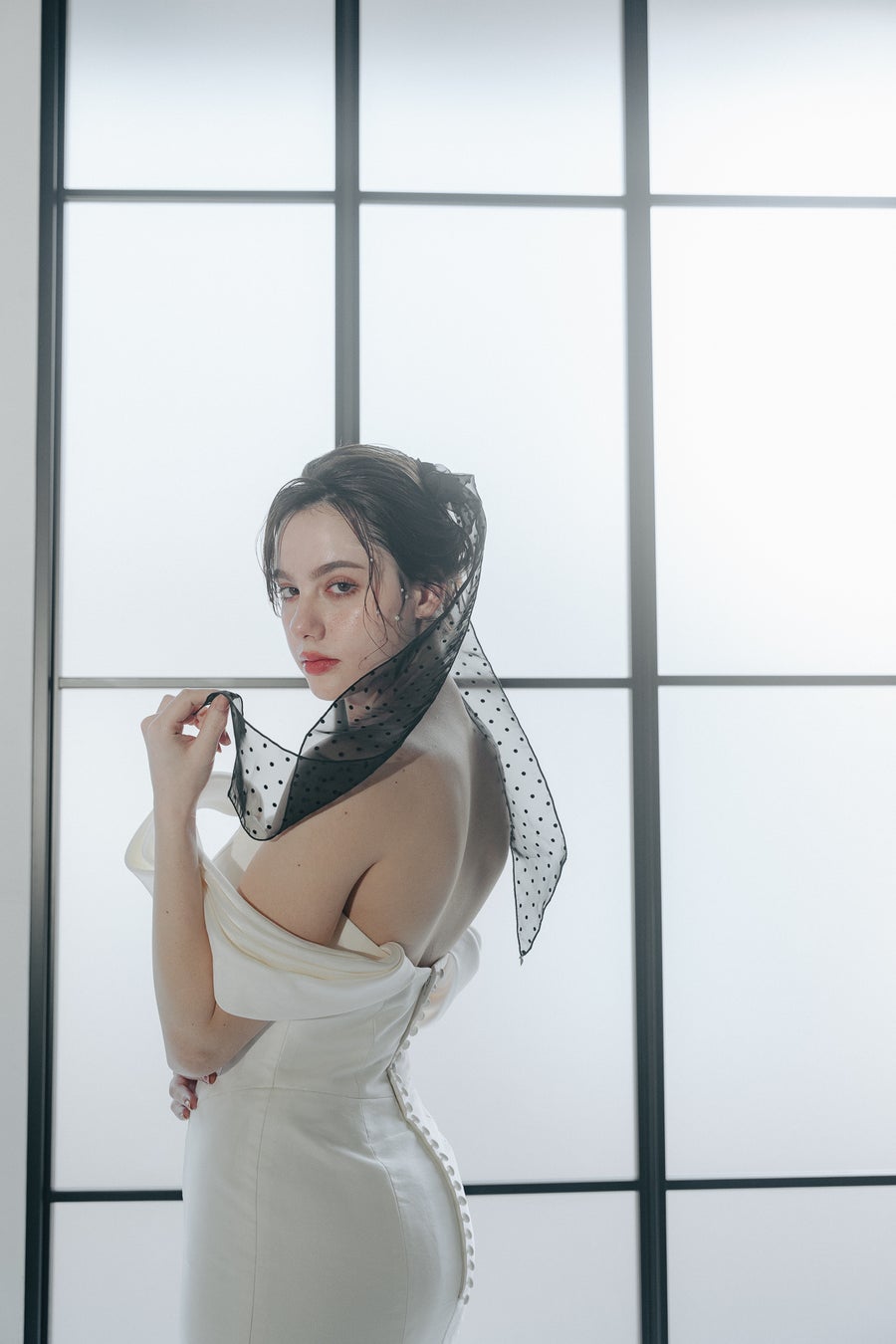 シンプルで洗練されたマーメイドラインのドレスです。程よい光沢感で、上品さの中に女性らしい柔らかさを演出。主役として堂々と特別な日を迎えていただきたいという想いが込められています。付属の立体的なリボンを纏うと華やかさをプラスしたり、付属のオフショルダーではより上品な印象を与えることができます。