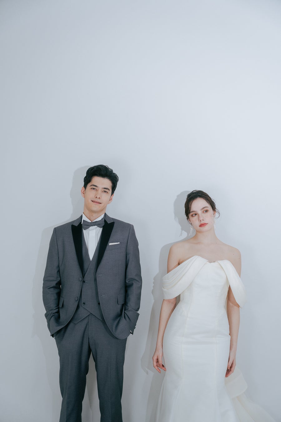 落ち着いたトーンと光沢感を抑えたマットな質感でスタイリッシュなタキシードです。幅広い年齢層にお召しいただきやすく、花嫁の隣にやさしく寄り添うような一着です。