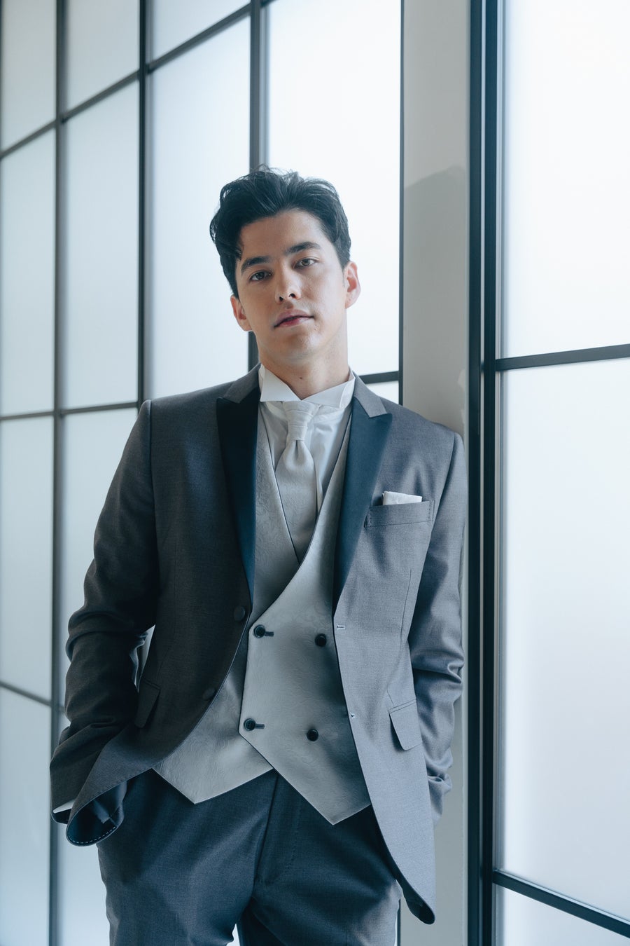 新作タキシード「Resoll Noir Noe(ノエ)」は、落ち着いたダークグレーが上品なフォーマル感を保ちながら、かしこまりすぎない印象を演出するタキシードです。柔らかく伸縮性のある生地で着心地にも配慮しました。ブラックのピークドラペルやリバーシブルベストが装いにメリハリを加え、世代やシーンを問わず品よく着こなせます。