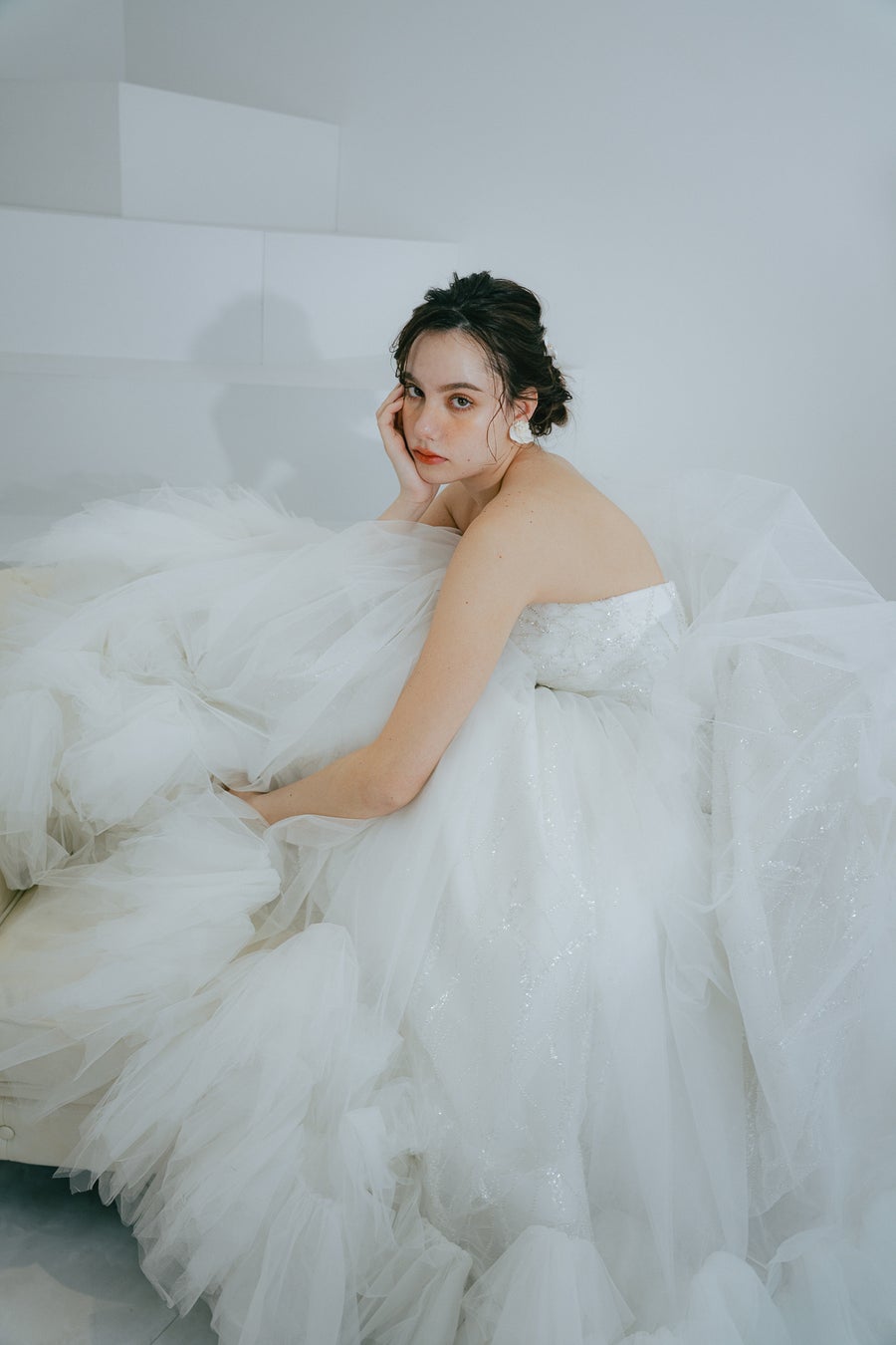 今回の新作ウェディングドレスは、「Resoll Nature Liora(リオラ)」「Resoll Nature Mico(ミコ)」「Resoll Royal Dazzle(ダズル)」の3型です。光(Lux)と花(Flora)を意味する「Liora」は、ドレス全体にフラワーモチーフを贅沢に散りばめ、華やかさと上品さを両立したAラインドレスです。ハートカットのビスチェや立体刺繍が美しく輝き、ヨークやオーバースカートで印象を自在に変えることも可能な、永遠に愛される“欲張りな一着”です。ラテン語で「輝く」を意味する「Mico」は、グリッターとビジューが流れるように施されたAラインドレスです。縦に連なるビジューレースがスタイルアップを叶え、際立つ輝きを演出します。リボンデザインのビスチェや付属のパフスリーブ、オーバースカートで表情を変えながら、特別な一日に自分らしく輝ける一着です。英語で「魅了する」を意味する「Dazzle」は、シンプルで洗練されたマーメイドラインが主役感を引き立てるドレスです。上質なサテンオーガンジーの程よい光沢が、上品さの中に女性らしい柔らかさを添えます。ウエスト部分の切り替えや付属アイテムにこだわりをもって、特別な日を堂々と迎えられる一着に仕上げました。
