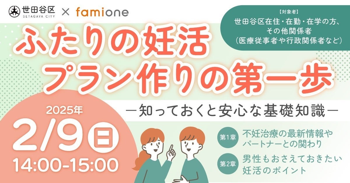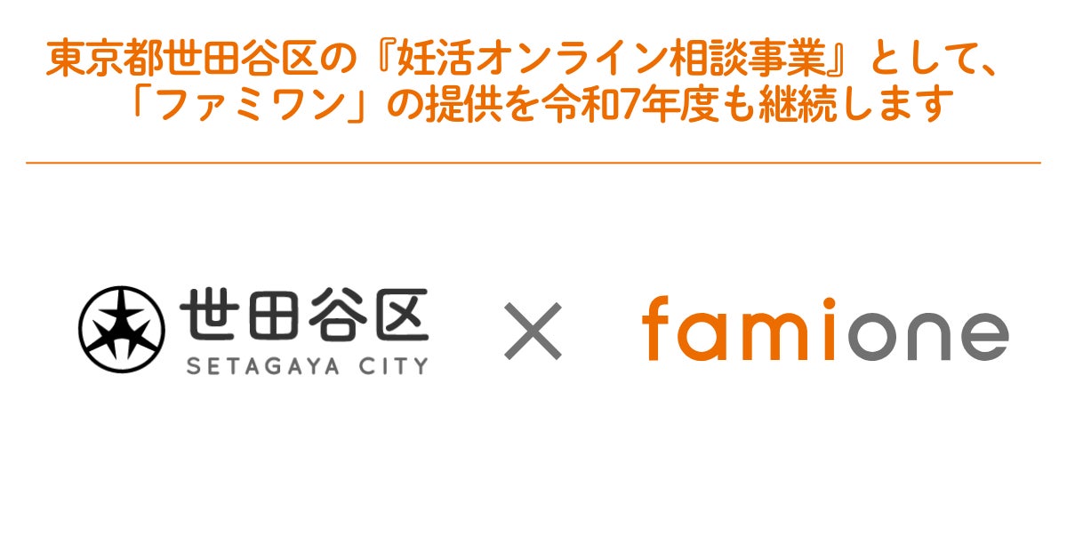 「子どもを願うすべての人によりそい 幸せな人生を歩める社会をつくる」をビジョンに掲げ、法人の従業員向け福利厚生や自治体の住民向け支援を行うヘルスケアサポートサービス「ファミワン」 https://famione.com/benefit/などを展開する株式会社ファミワン(本社:東京都渋谷区、代表取締役:石川勇介)は、東京都世田谷区(区長:保坂 展人、以下世田谷区)からの委託を受け、「妊活オンライン相談事業」において、令和7年度のサービスの提供継続が決定いたしました。