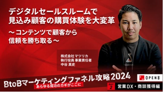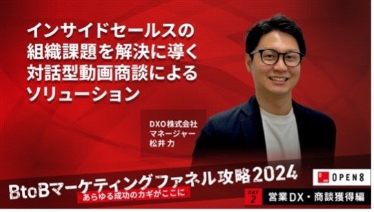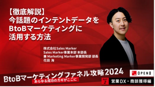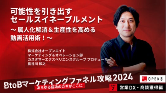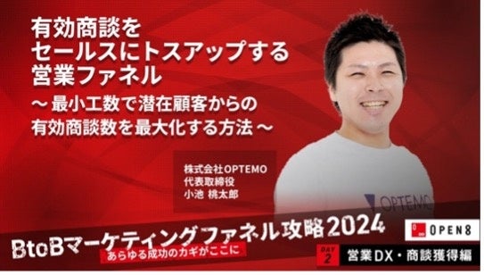 株式会社イノベーション(東証グロース 証券コード3970)のグループ会社である、株式会社Innovation & Co(本社:東京都渋谷区、代表取締役社長:齊藤和馬、以下「Innovation & Co」)は、株式会社オープンエイト(本社:東京都千代田区、代表取締役社長兼CEO:髙松雄康、以下オープンエイト)と共催で、2024年10月9日(水)に、『“あらゆる成功のカギがここに” B to Bマーケティングファネル攻略 Day2「営業・受注編(営業DX、効率化)』をテーマとしたイベントを開催することをお知らせいたします。