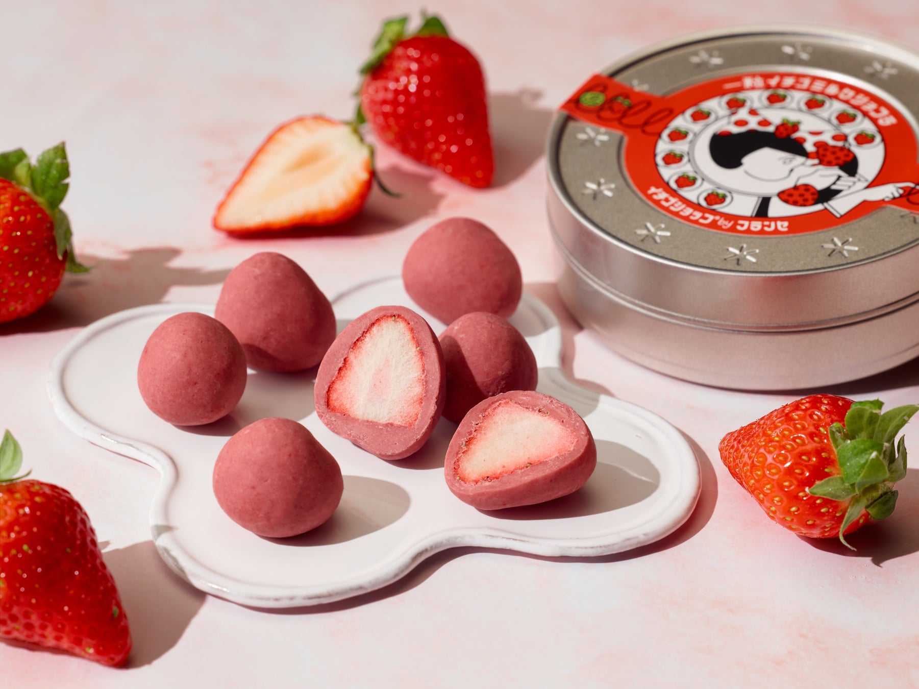 国産イチゴを一粒まるまる使用し、ルビーチョコレートで包みました。相性のよいふたつのマリアージュが、イチゴの香りをより 一層引き立てます。