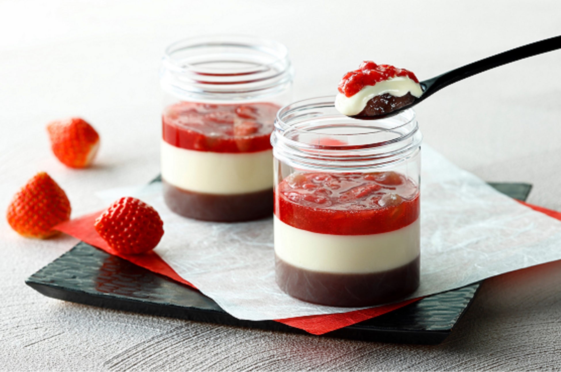 北海道産小豆のあんこを使用した水ようかんと口どけなめらかなマスカルポーネムースの上にイチゴソースと黒糖わらび餅をトッピング。甘酸っぱいイチゴとやさしい甘さの水ようかんとムースがボトルに詰まった、和洋折衷のかわいいスイーツです!