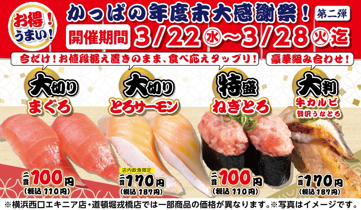 『かっぱの年度末大感謝祭』第二弾では、2023年3月22日(水)~3月28日(火)の期間、人気ネタ「まぐろ」「ねぎとろ軍艦」「とろサーモン」「牛カルビ炙り」を食べ応えたっぷりの大切り・特盛、お値段据え置きでご提供いたします。