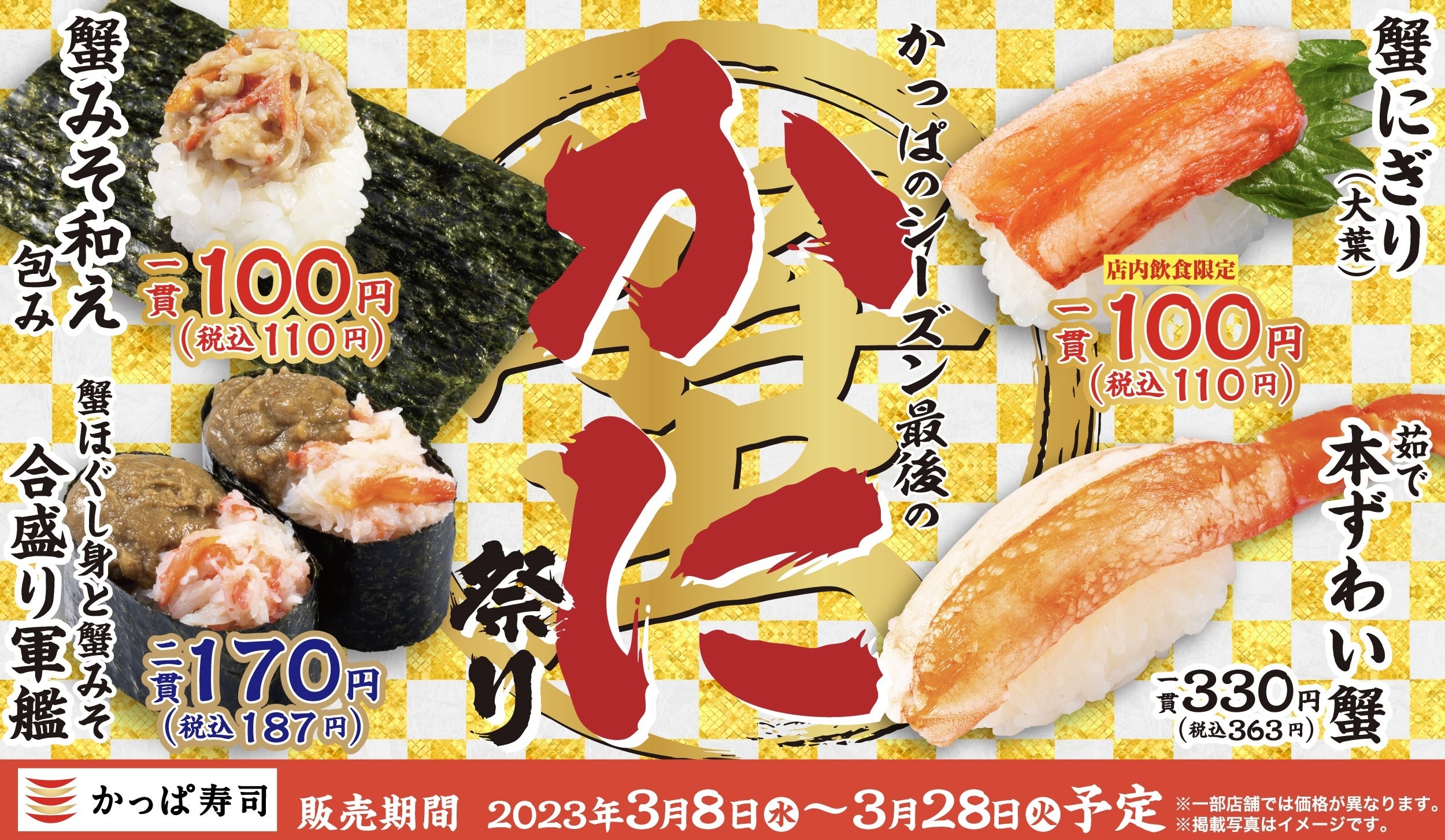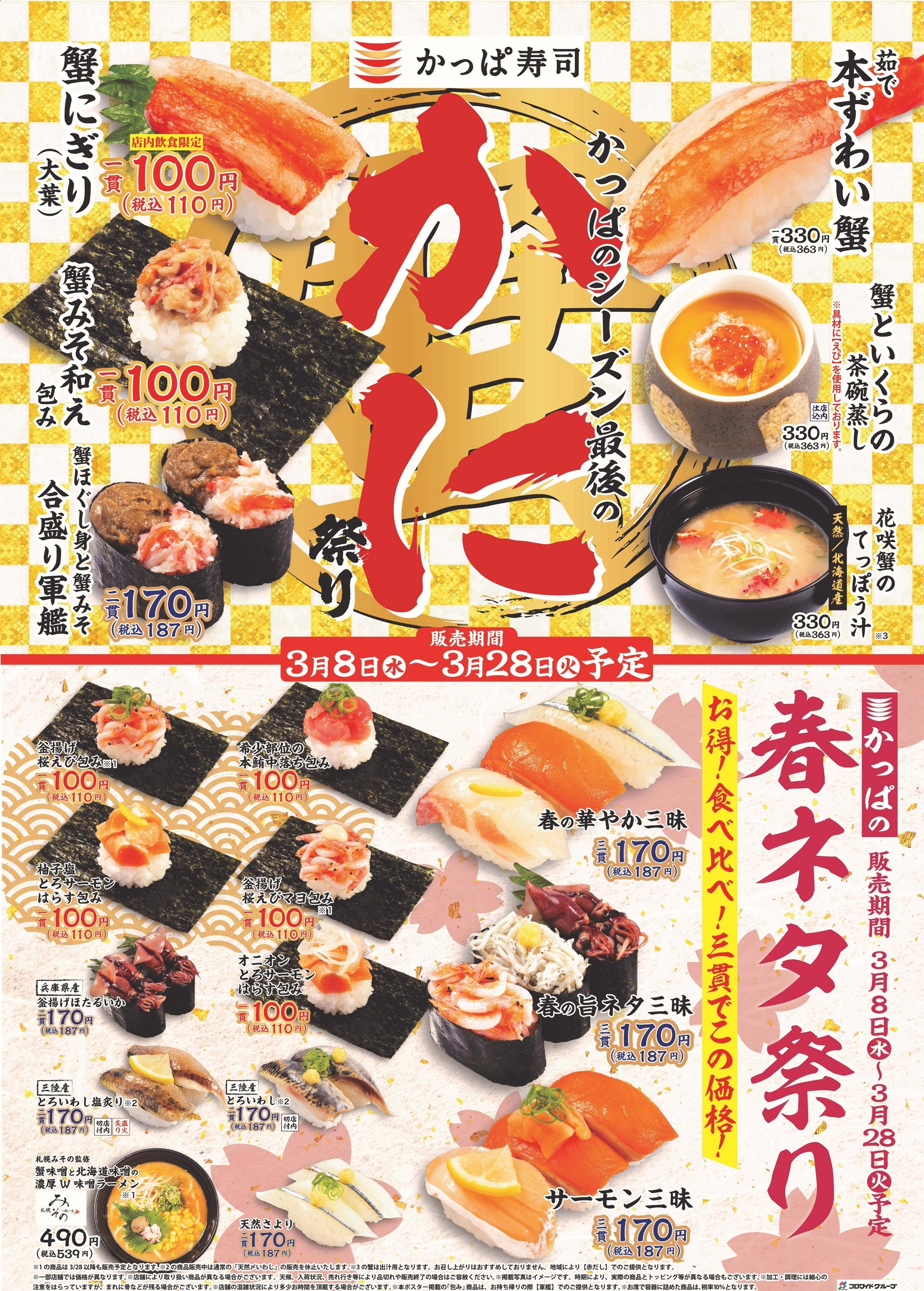 3月8日(水)より開催中『かっぱのシーズン最後のかに祭り』&『かっぱの春ネタ祭り』