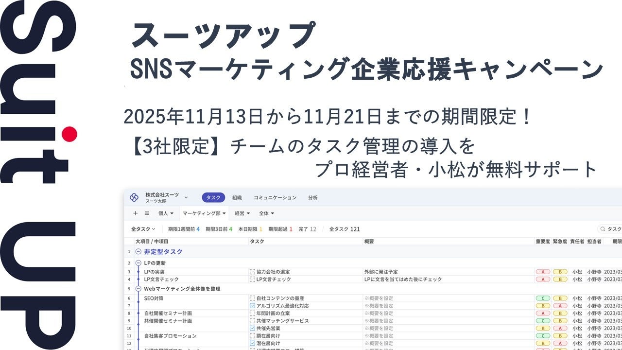 株式会社スーツ(所在地:東京都千代田区、代表取締役社長CEO:小松 裕介)は、チームのタスク管理・プロジェクト管理ツール「スーツアップ」において、SNSマーケティング企業応援キャンペーンを実施いたします。
