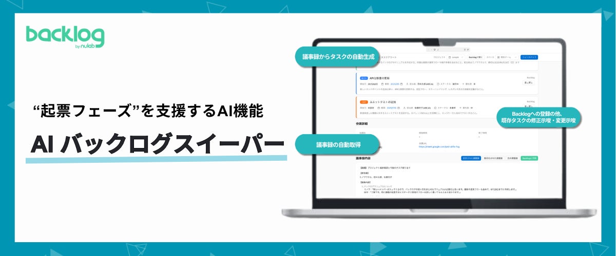 株式会社ヌーラボ(本社:福岡県福岡市、以下 ヌーラボ)は、プロジェクト・タスク管理ツール「Backlog」におけるAI機能群として、会議内容からタスクを自動で抽出・起票する「AI バックログスイーパー」をBacklogアドオン(※1)として本日2025年11月14日より提供を開始しました。