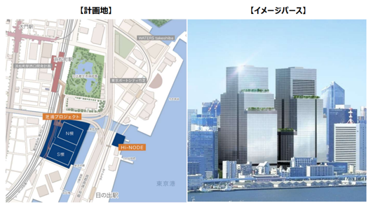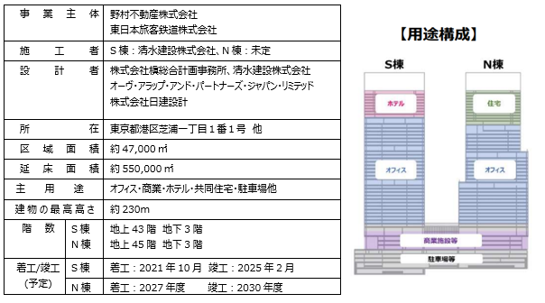 本プロジェクトは、野村不動産株式会社と東日本旅客鉄道株式会社が共同で推進する国家戦略特別区域計画の特定事業であり、浜松町ビルディング(東芝ビルディング:東京都港区芝浦 1-1-1)の建替事業として、ツインタワーの建設(S棟:2025年2月竣工予定、N棟:2030年度竣工予定)を進めています。区域面積約4.7ha、延床面積約 55 万㎡、オフィス・ホテル・商業施設・住宅を含む、約 10 年間に及ぶ大規模複合開発です。世界的建築家である槇文彦氏を設計者に迎え、東京ベイエリアの新たなシンボルとなる国際ビジネス・観光拠点を創出します。