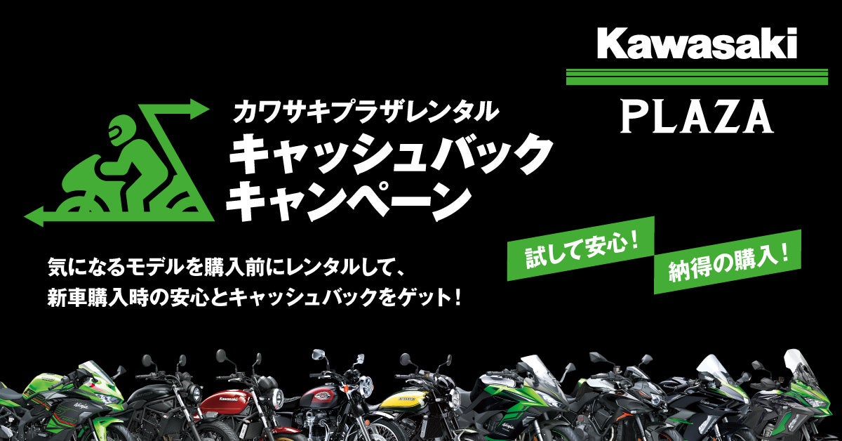 株式会社カワサキモータースジャパン(本社:兵庫県明石市、代表取締役社長:桐野 英子)が展開するカワサキプラザネットワークでは、期間中カワサキプラザレンタルをご利用の上、同一モデルシリーズをご成約のお客様へレンタル料金をキャッシュバックする「カワサキプラザレンタル キャッシュバックキャンペーン」を4月1日より実施いたします。