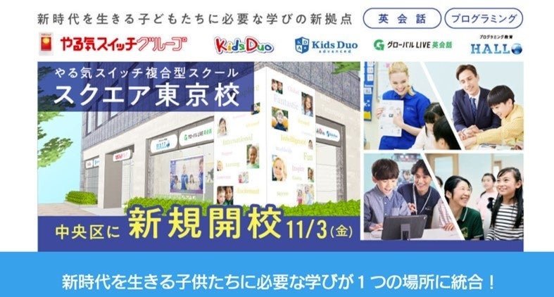 やる気スイッチのフラッグシップスクール「やる気スイッチスクエア東京校」は、子どもたちに「英会話」と「プログラミング」を通してお子さまがこれからの時代を生き抜く「自分力※1」を育むことを目的に、「新時代を生きる子どもたちに必要な教育カリキュラムを総合的に届ける」拠点として誕生します。