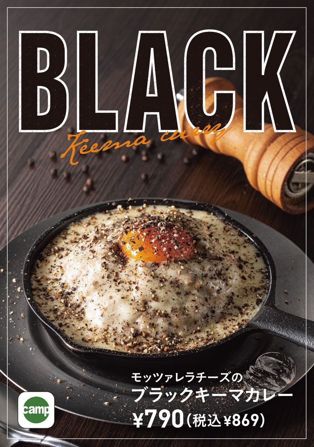 ローマの"三大パスタ"のひとつとして親しまれている「カチョエペペ」をイメージした「モッツアレラチーズのブラックキーマカレー」は、スキレットでご飯ごと火にかけ熱した野菜を食べるカレーcampらしさのビジュアル。