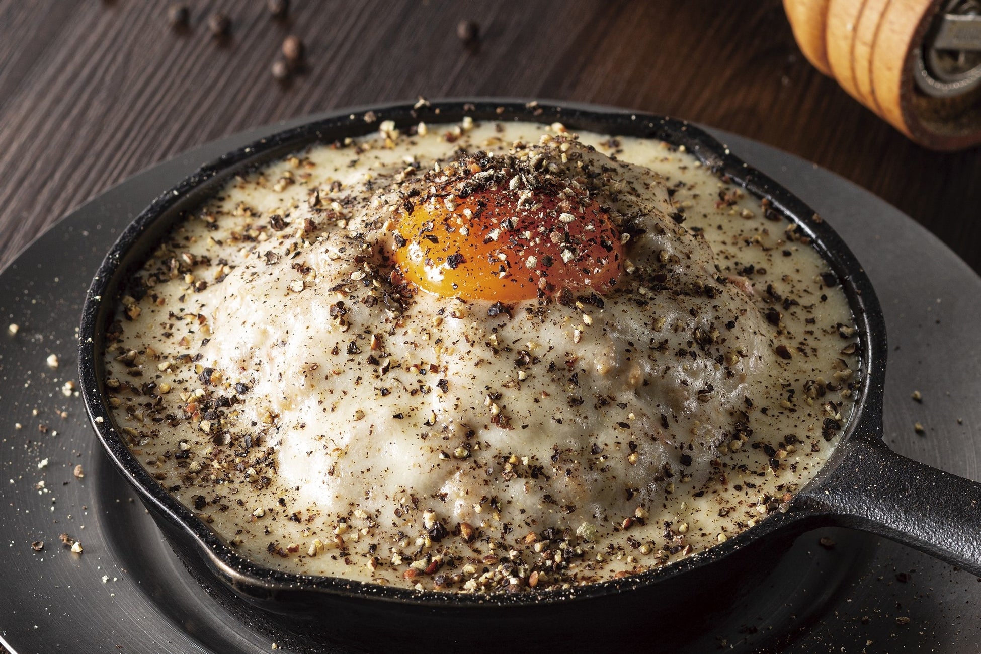 挽肉たっぷりのキーマカレーとコクのあるとろーりモッツアレラチーズに卵黄、たっぷりのブラックペッパーでスパイシーに仕上げました。