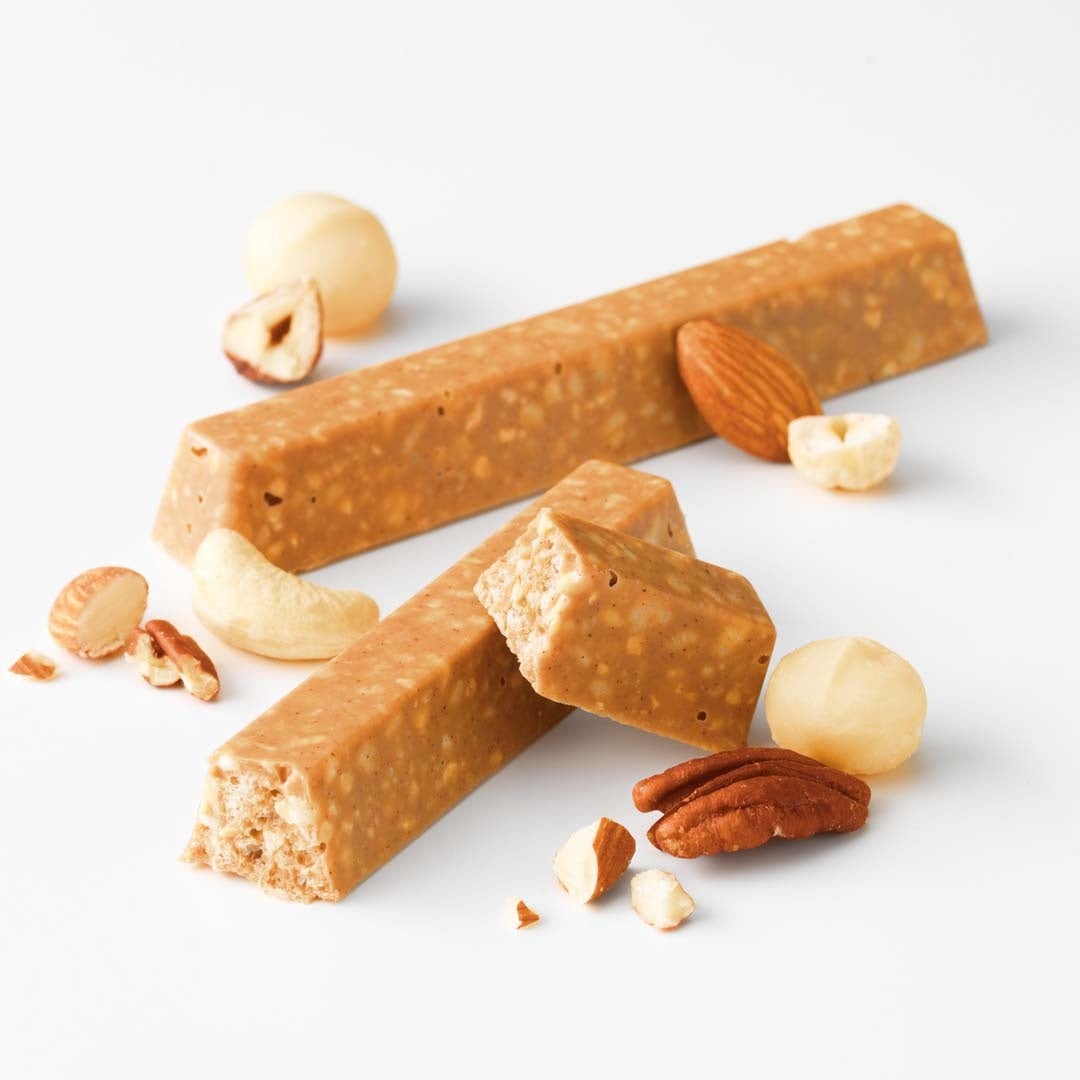ヘーゼルナッツとアーモンドのペーストをブレンドしたナッツの味わい豊かなホワイトチョコレートに、アーモンド、ペカン、カシュー、マカダミアの4種類の砕いたナッツをぎっしりと詰め込み、クッキーとパフで歯ごたえ良く仕上げました。