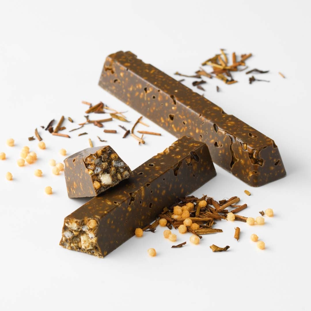 炭火焙煎した香り高いほうじ茶と、一番茶のみを使用したほうじ茶をブレンドしたチョコレートに、アーモンド、ペカン、カシュー、マカダミアの4種類の砕いたナッツを入れました。クッキー、パフで食感の良さを出し、さらにぶぶあられで香ばしさをプラスしています。