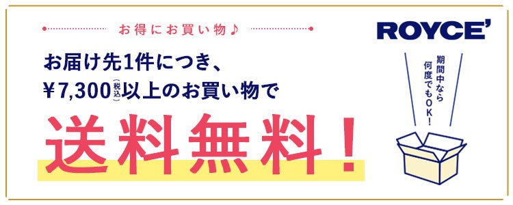 ロイズ通信販売(公式オンラインショップ・電話・FAX・はがき)、ロイズ直営店、札幌丸井今井店、厚別サンピアザ店にて、お届け先1件につき、商品代金の合計が¥7,300(税込)以上の場合。