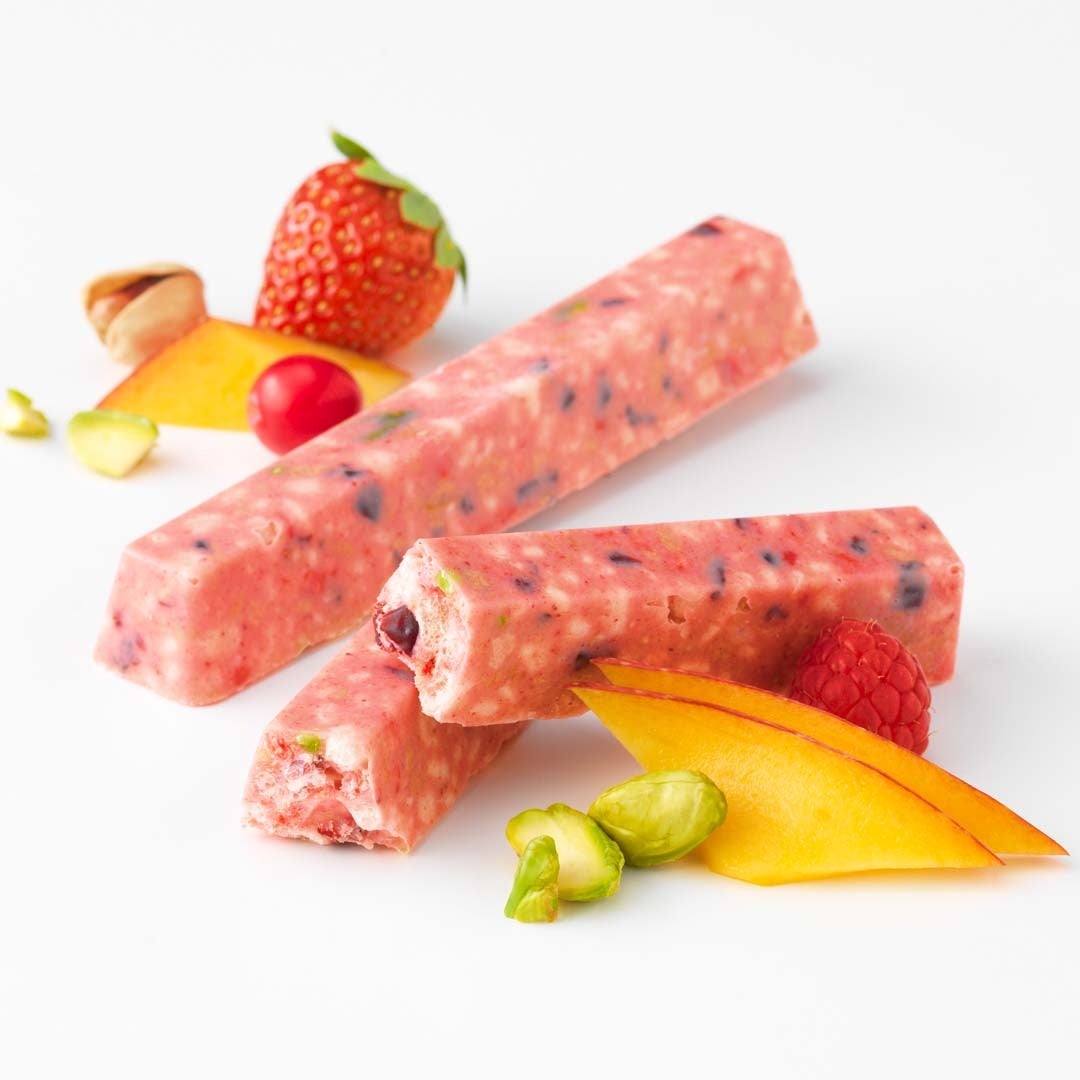 ストロベリーのパウダーをブレンドしたホワイトチョコレートに、ドライフルーツのマンゴーとクランベリー、フリーズドライのストロベリー、ラズベリーパウダー、ピスタチオを詰め込み、パフとフィアンティーヌで食感の良さを出しました。フルーツの豊かな味わいとローストしたピスタチオの風味が楽しめます。