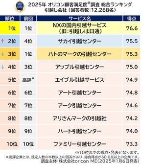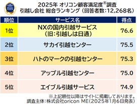 実際のサービス利用者を対象に第三者の立場で顧客満足度調査を実施する株式会社oricon ME(本社:東京都港区 代表取締役社長:小池 恒 略称:オリコン)は、『引越し会社』についての満足度調査を実施し、2025年1月6日(月)14時にその結果を「オリコン顧客満足度®」公式サイト内( https://life.oricon.co.jp/ )にて発表いたしました。ランキングの結果は、下記の通りとなりました。