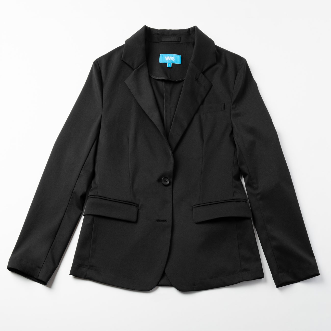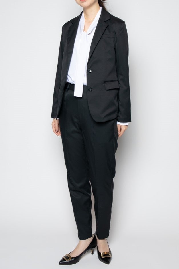 特徴:ビジネスシーンにマッチする、立体的ですっきりとしたジャケット。2つボタンで胸元に綺麗なVゾーンと、ウエストの絞りを抑えることで縦ラインが強調され、キレイ見せできるシルエット。