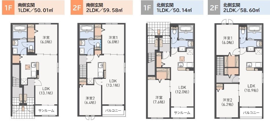 - 南側玄関タイプと北側玄関タイプで異なる間取りを採用