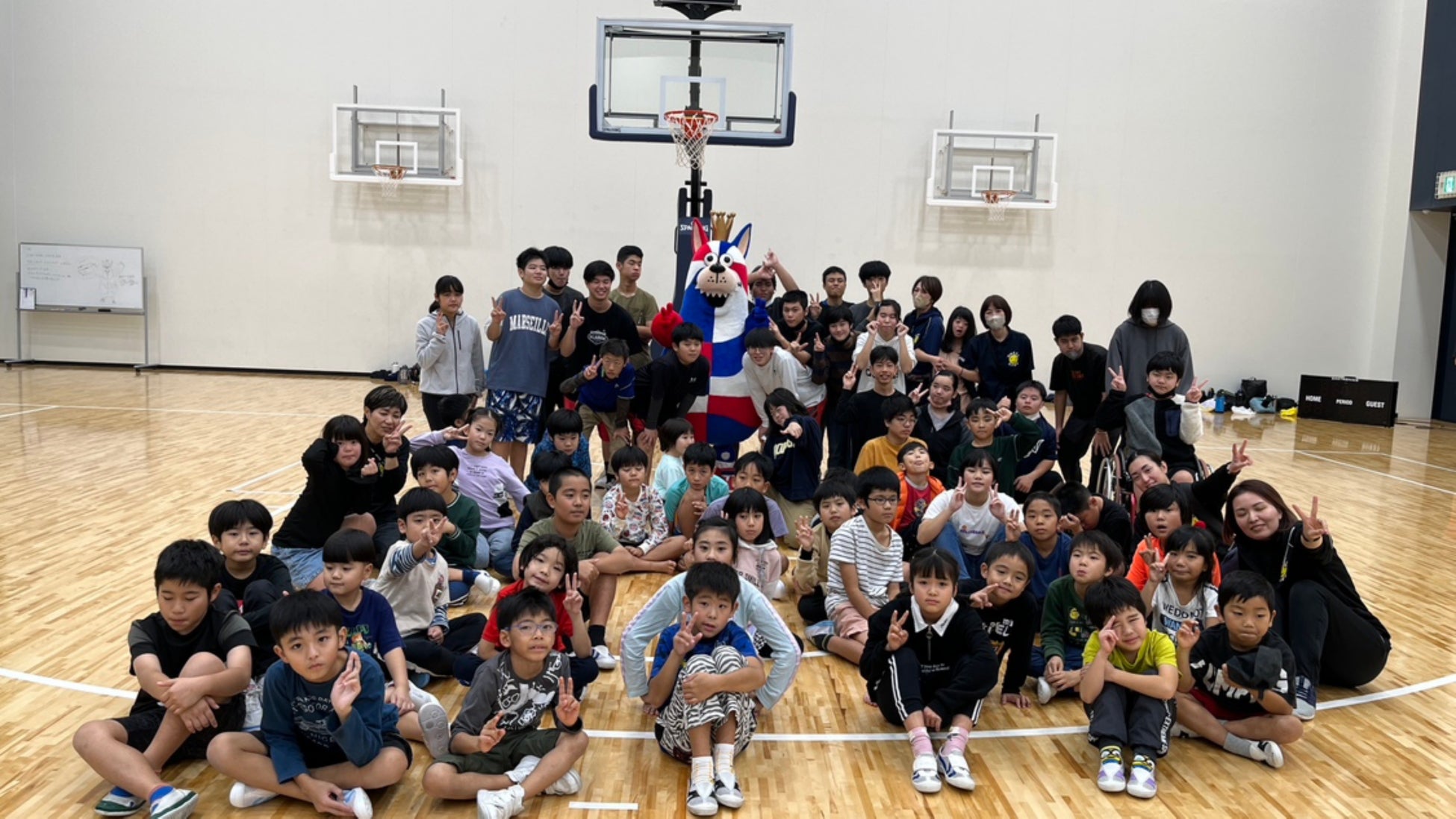 1月5日(金)に沖縄アリーナにて「サポートセンタースマイルキッズ」の利用者と職員総勢85名と、キングスバスケスクールコーチやゴーディーとの交流会を実施しました。