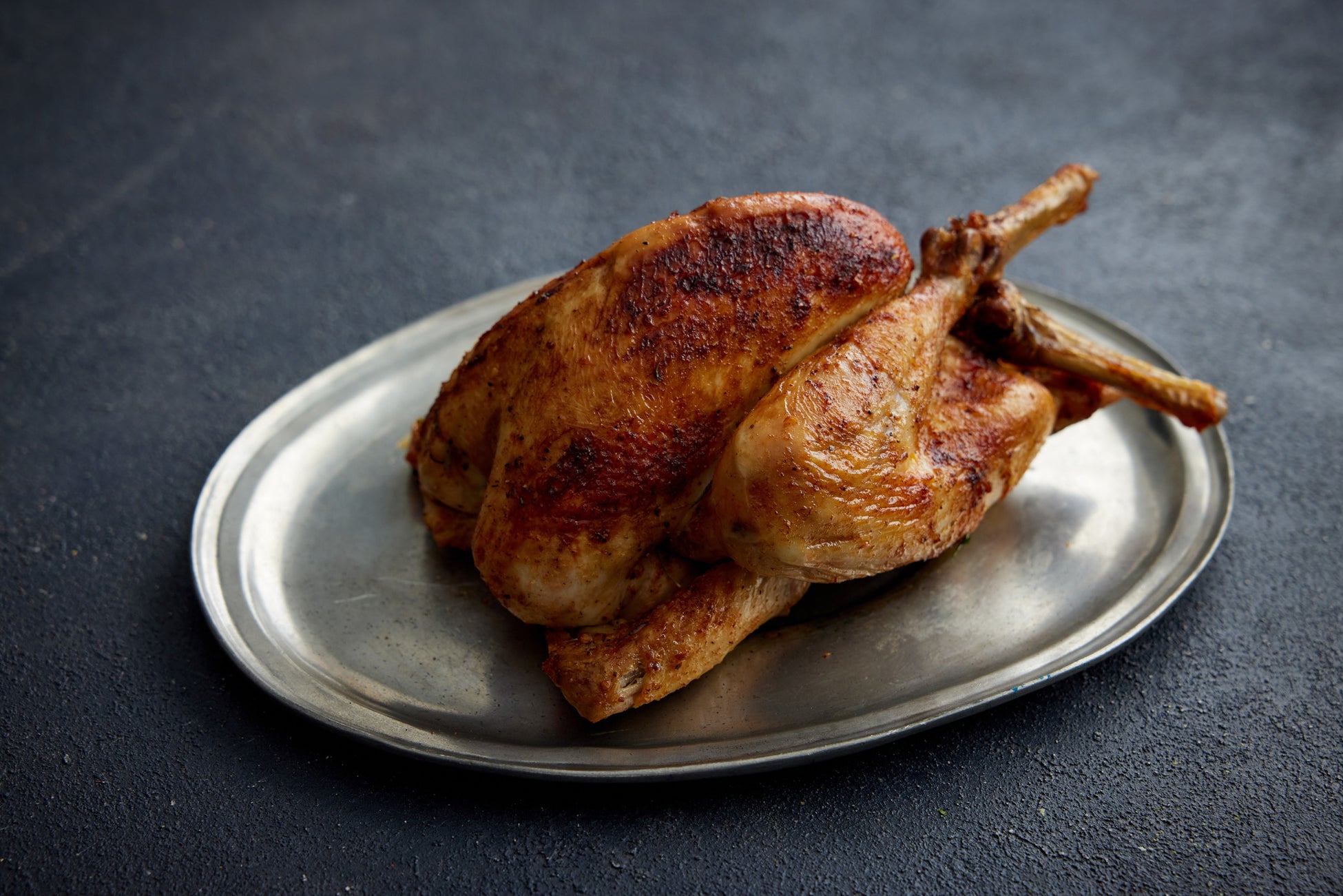 アメリカのDEAN & DELUCAの『COOK BOOK』から着想を得たクラシックなローストチキンです。ハーブとともに下味をつけ、ミックススパイス入りのグースファット(鴨脂)を塗りながら、香り高く風味豊かに焼き上げました。最初に低温でじっくり焼き、中はしっとりジューシーに。仕あげに高温で焼いて、表面はパリッと香ばしく。