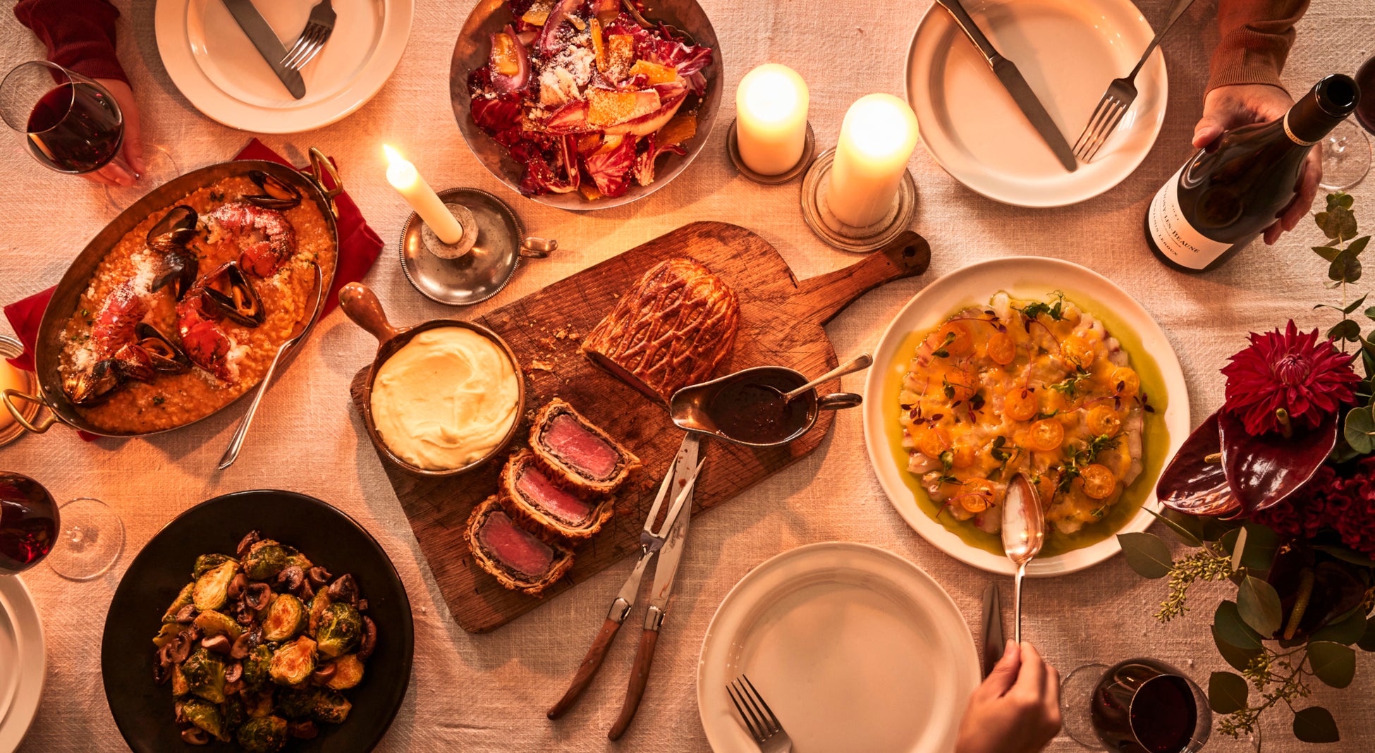 大切な人たちと集うホリデーの食卓には、ゲストに合わせて華やかなお料理を。今年新たに登場するのは、前菜からメインまでたのしめるにぎやかなパーティーを盛り上げるセット「POTLUCK TABLE(ポットラック テーブル)」、イギリスのホリデー料理 “ビーフウェリントン”を華やかな一品に仕あげた「鹿児島産黒毛和牛のパイ包み焼き 黒トリュフソース」や、この時季ならではの「ぎたろう軍鶏のクラシックローストチキン」。みんなで囲める、思わず歓声を上げたくなるメインディッシュが勢揃いです。