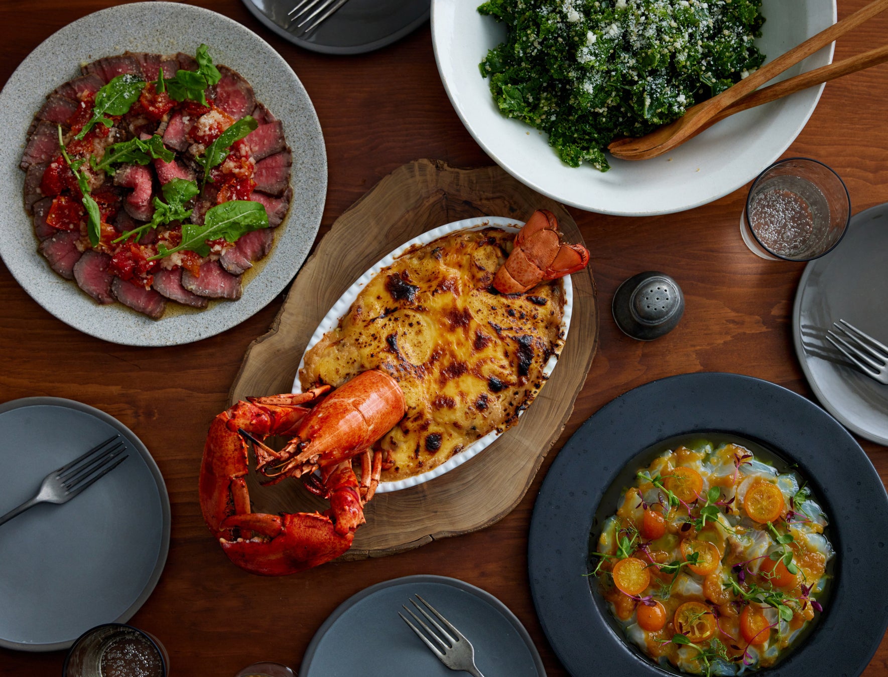今年新たに登場したお料理「ロブスターグラタン」に、DEAN & DELUCA の定番を組み合わせました。トマトとバルサミコでシンプルに仕立てるタリアータ。長崎のつばき鯛に、金柑のソースとバイマックルのオイルを合わせた色鮮やかなカルパッチョ。そして、ケールとキヌアにレモンドレッシングをかけたロングセラーのサラダ。持ち寄りパーティーを意味する“ポットラック”の名前を付けた、前菜からメインまでたのしめるご提案です。