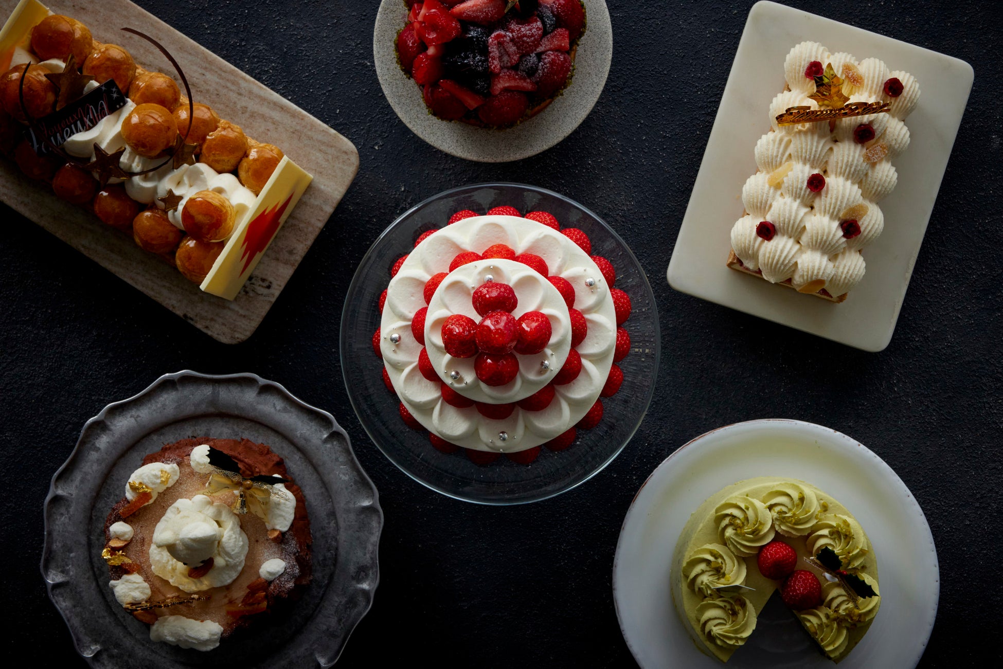 素材のよさを丁寧に生かしたパティスリーから届くクラシカルなストロベリーショートケーキ、洋酒が薫るチョコレートケーキ、ベリーづくしのタルト、カットすると2種のスポンジの織りなすチェッカー模様が登場するピスタチオチェッカーケーキなど、パティシエの腕とセンスが光る特別なケーキを、バラエティ豊かにご用意しました。