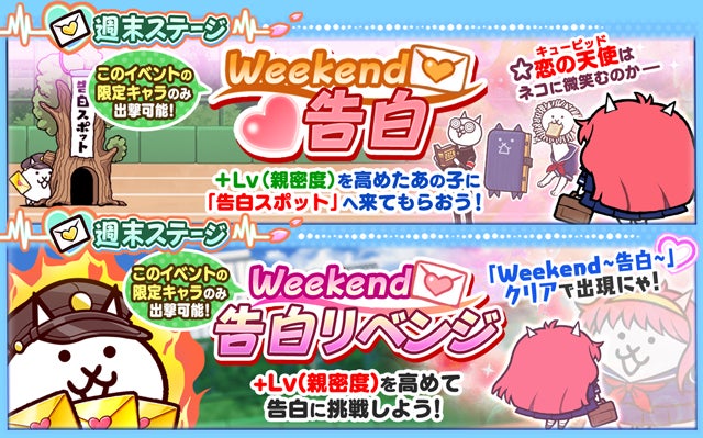 週末には「Weekend~告白~」ステージが登場!イベントガチャから手に入る限定キャラクター4体と販売中の「ネコ校長」のみが出撃できます。