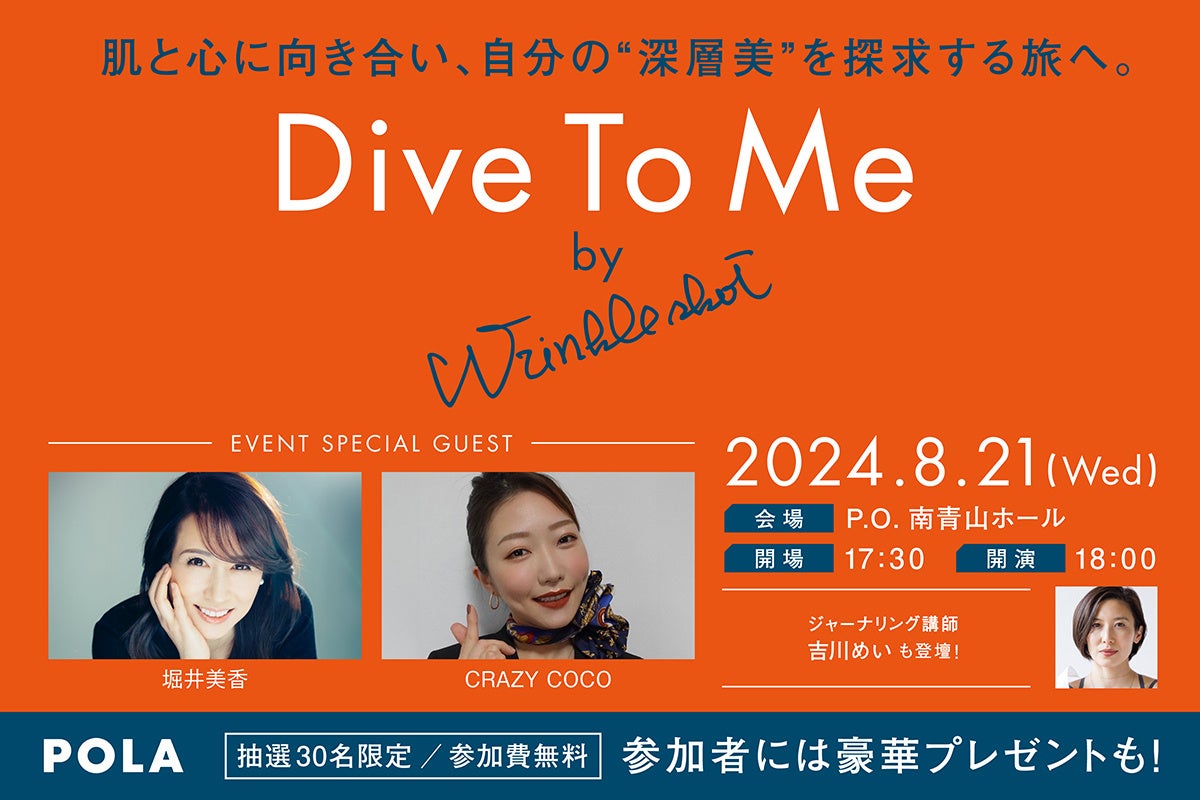株式会社ポーラ(本社:東京都品川区、社長:及川美紀)は、日本で初めて※1シワを改善する医薬部外品を発売した「リンクルショットブランド」より、2024年8月21日(水)に、自分の「心」や「肌」の奥深くに意識を向けて、深層からの美しさを目指す「深層美」を探求するイベント「Dive To Me by Wrinkle shot」を、P.O.南青山ホールにて開催します。抽選で30名様を無料ご招待し、ご参加いただいた方には、日本で初めて※2シワ改善有効成分として承認され、肌の奥深く※3に届く「ニールワン®」※4を配合したリンクルショット メディカル セラム本品と、オリジナルの限定プレゼントをご用意しています。
