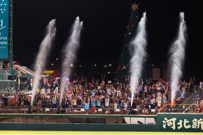 試合の演出や応援に合わせて、水を大量に噴射します。ずぶ濡れになりながら、暑い夏の応援をお楽しみいただけます。