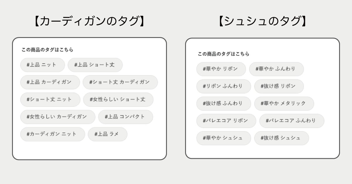 「カーディガン」「リボン」など汎用的なキーワードから「女性らしい」「抜け感」といったユーザー層の感覚に寄り添ったものまでバラエティに富んだハッシュタグが商品詳細ページに表示されるようになりました。「上品 ニット」「華やか リボン」など、ユーザーが興味を持ちやすいキーワードを組み合わせ、掲出することでより直感的に商品を探しやすくなり、サイト内の回遊性向上をサポートし、新たな商品との出会いを創出します。