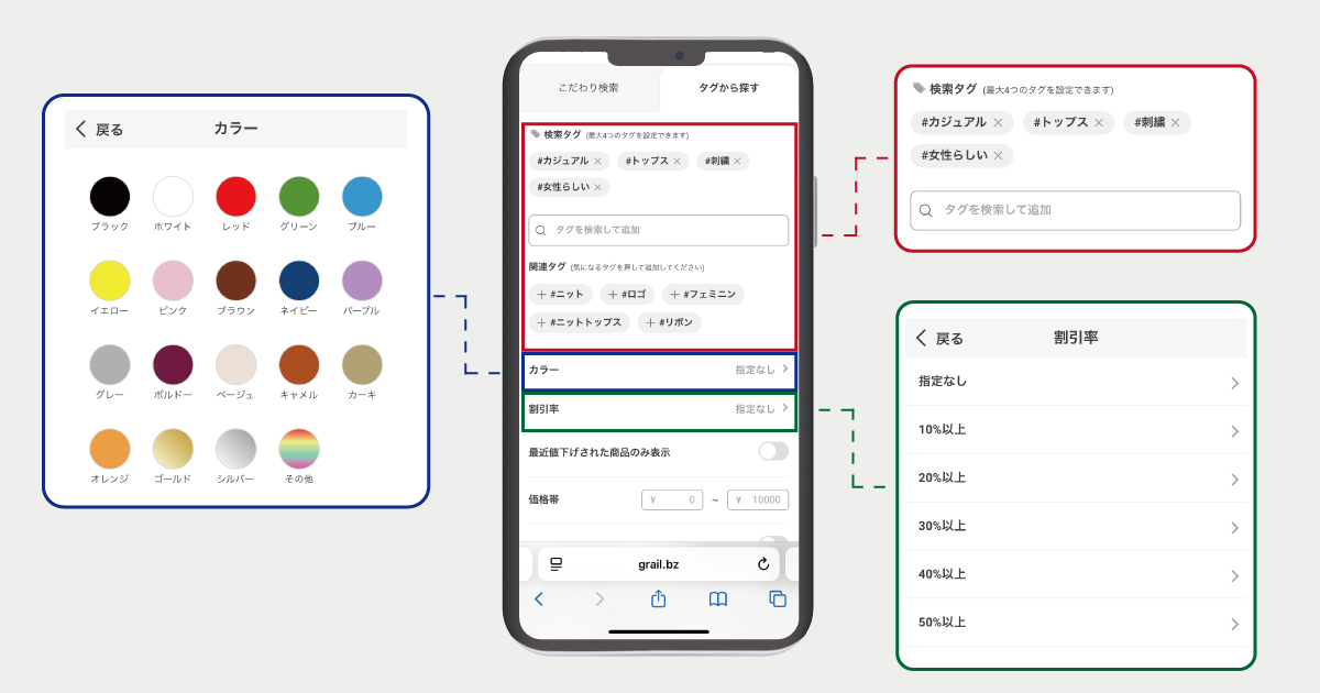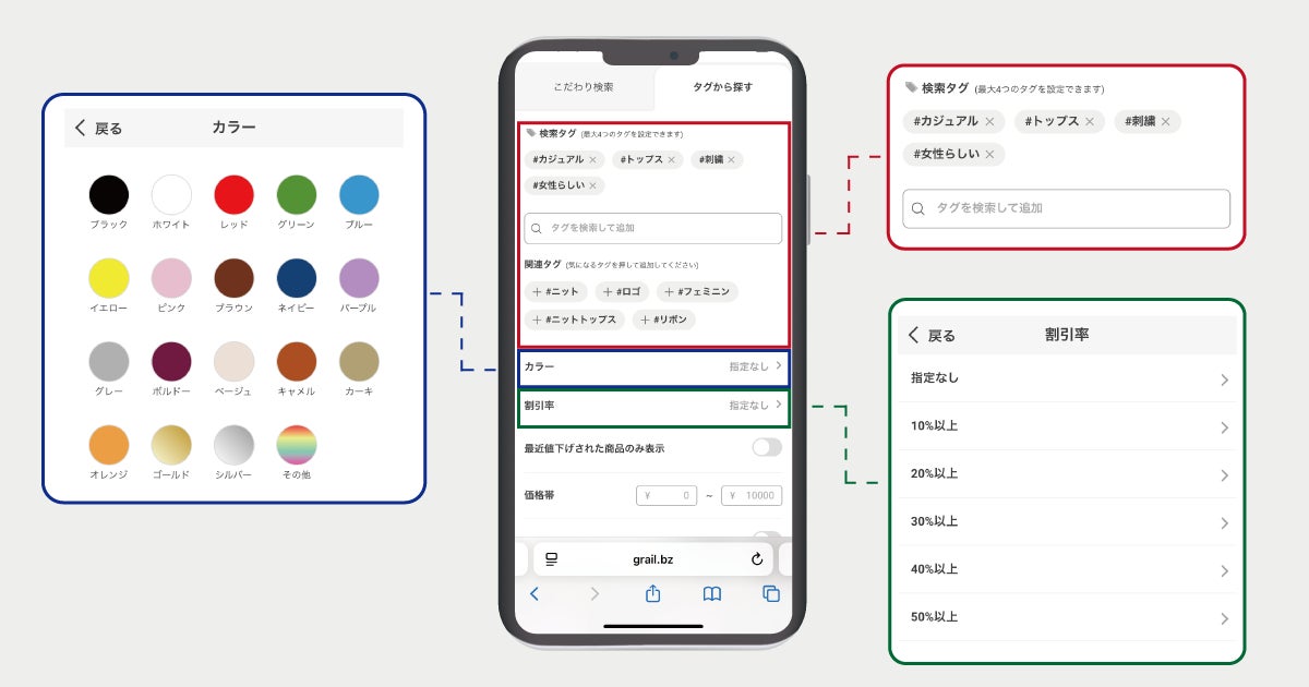 ハッシュタグから遷移した検索結果ページにて「カラー」や「割引率」などの条件を追加し、絞り込みが行えるようになりました。また「タグの検索」と「関連タグ」から最大4つのハッシュタグを組み合わせ、アイテムを検索することが可能となりました。こうした機能により、ユーザーが持つ潜在的なニーズを可視化するだけでなく、希望に近い商品をより簡単に表示することができ、顧客体験の向上に貢献します。
