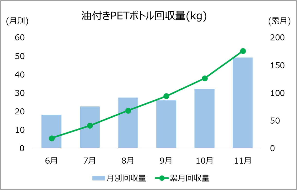 回収された油付きPETボトルは事前に周知した出し方に則り、ほとんどがきれいな状態であり、また回収量が徐々に増加傾向であったことから、この取り組みに対する生活者の関心が高いことが推察されました。