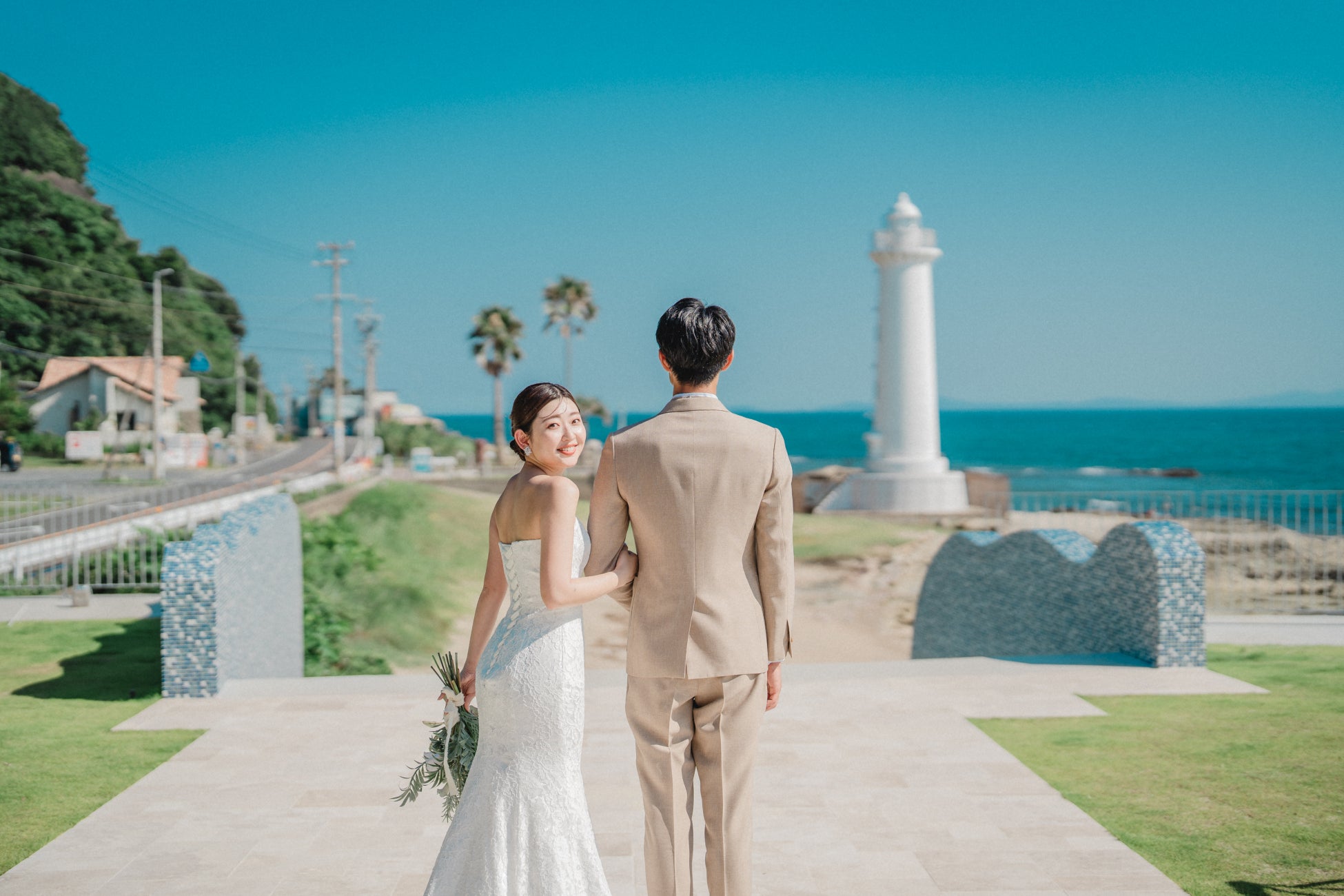 美浜町のシンボルであり、フォトウエディングの聖地でもある【野間埼灯台】から徒歩1分の目の前にあり、灯台と海、山に囲まれた大自然の中で非日常のセレモニーを叶えます。