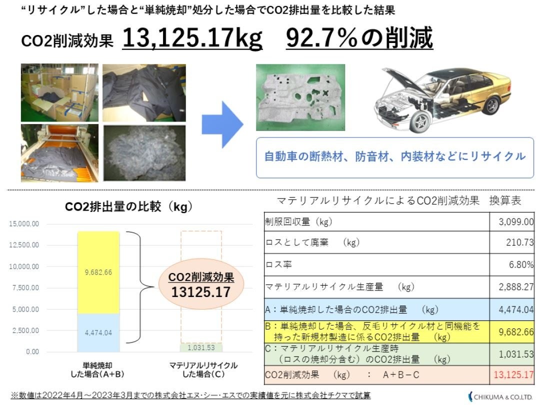 脱炭素の見える化の実現に向けて、使用済み制服のリサイクルに取り組んでいます。福岡県北九州市との共同事業であるマテリアルリサイクル企業、株式会社エヌ・シー・エスを活用し、削減効果を数値化、見える化させる取り組みを進めており、衣料品の回収を依頼された企業・団体に対してその効果を数値化、公表しています。