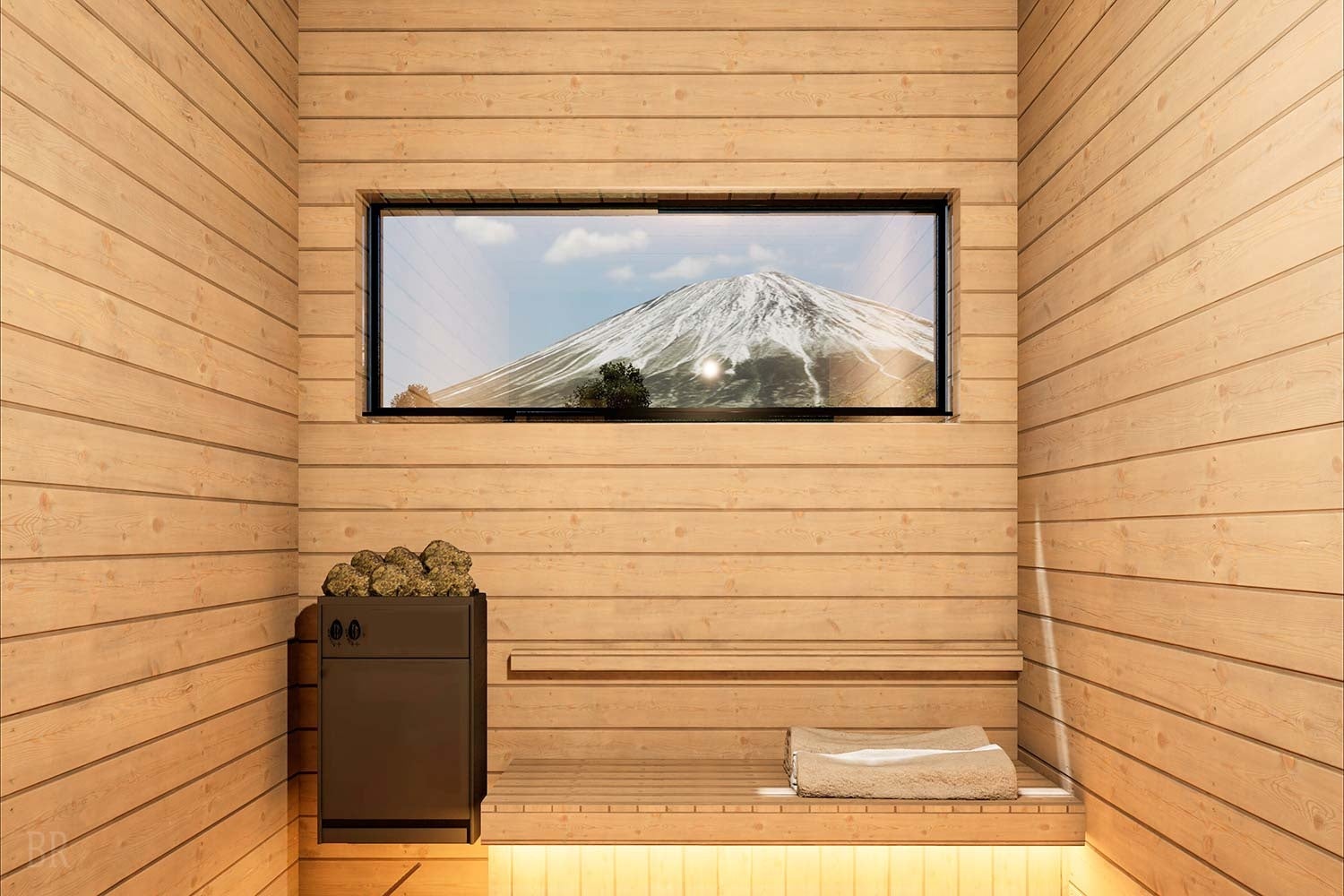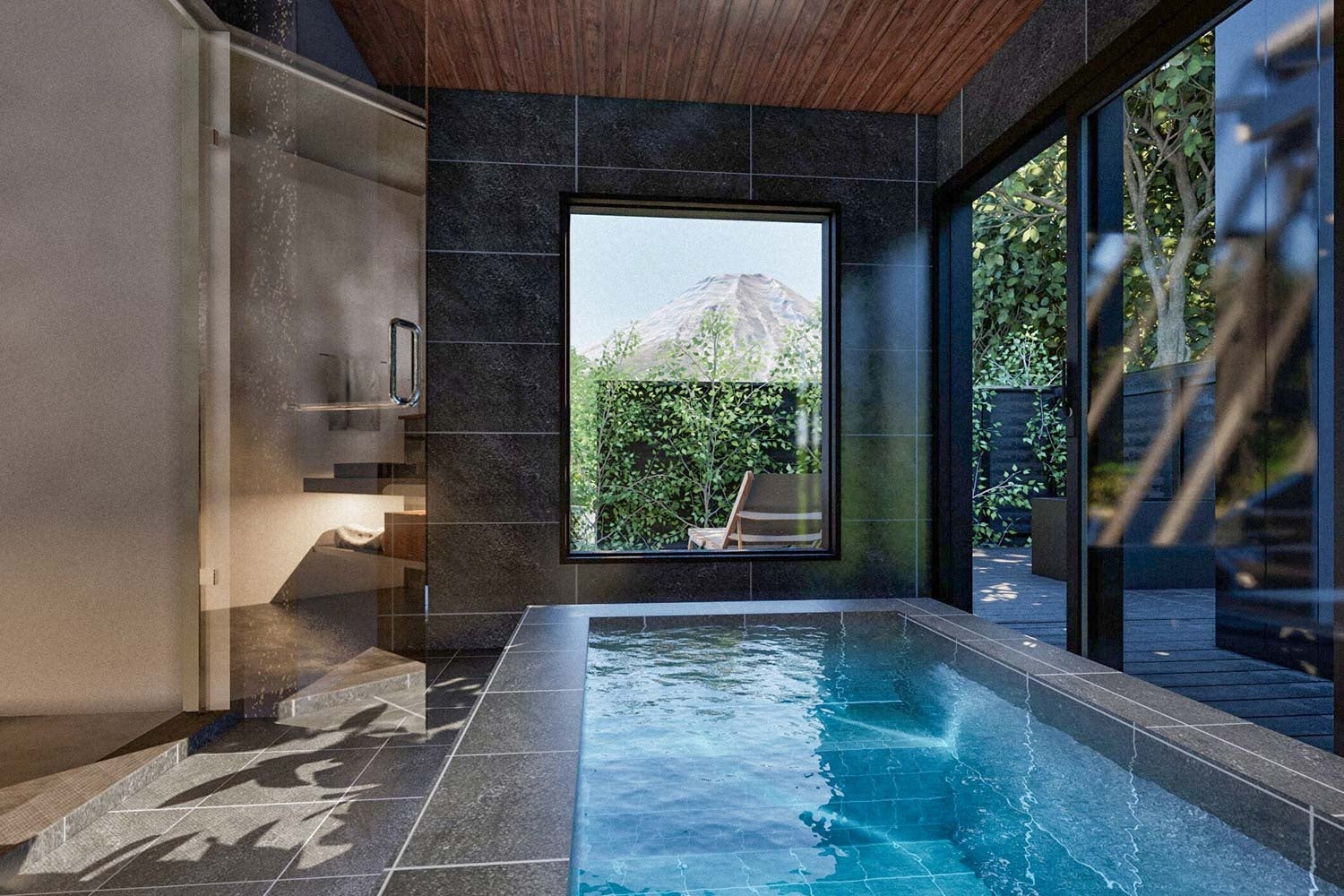 全棟の客室には、富士山の深層水を使用した「バナジウム鉱泉」を配湯した客室風呂と、完全プライベートサウナを完備。富士山を眺めながらサウナで汗を流した後は、雄大な自然に包まれて外気浴を満喫。誰にも邪魔されない贅沢な空間で、心身ともに癒される至福のひとときをお過ごしいただけます。