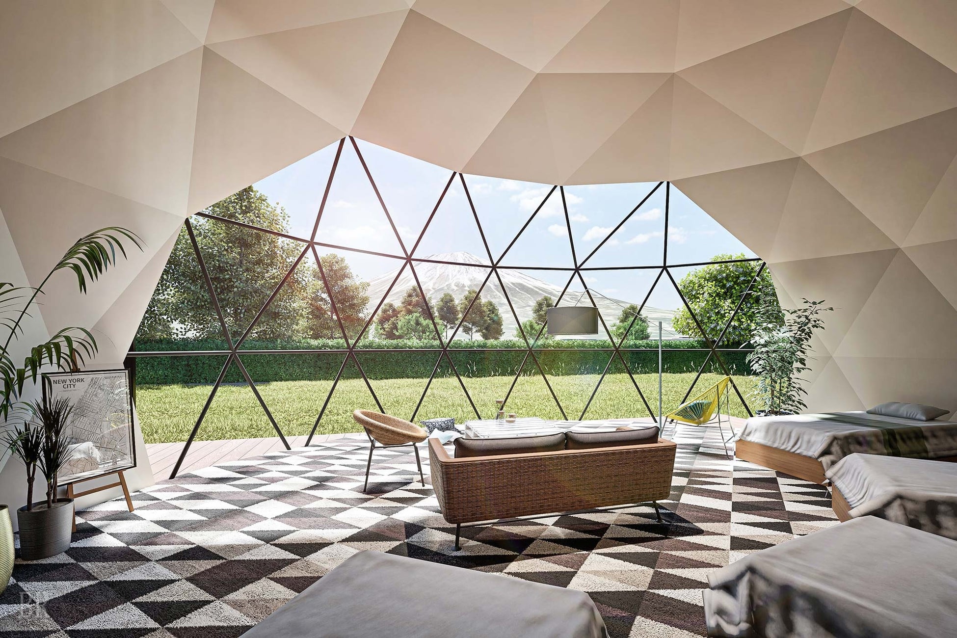 日本初、最大20名の宿泊が可能なツインドームプレミアム。2棟の10m大型ドームテント連結による圧倒的なスケールとプライベート空間を演出します。富士山の形を模したプライベートプールを備えた超大型の客室は、団体旅行や研修など、大人数での滞在に最適です。