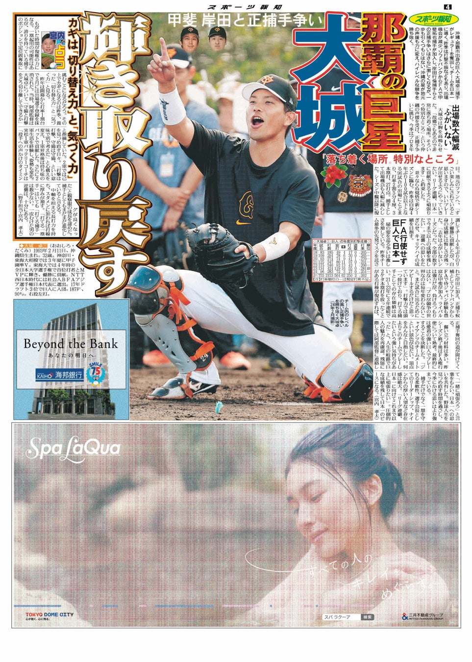 スポーツ報知を発行する報知新聞社(代表取締役社長・依田裕彦)では巨人の那覇キャンプに合わせ、「巨人那覇キャンプ特別版」を発行しました。阿部監督の連覇、そして日本一奪回への意気込みや、田中将大投手、甲斐拓也捕手、ライデル・マルティネス投手など新戦力の紹介などを掲載。那覇市出身の大城卓三選手の特集もあります。キャンプ期間中、沖縄セルラースタジアム那覇などで無料でお手に取っていただけます。