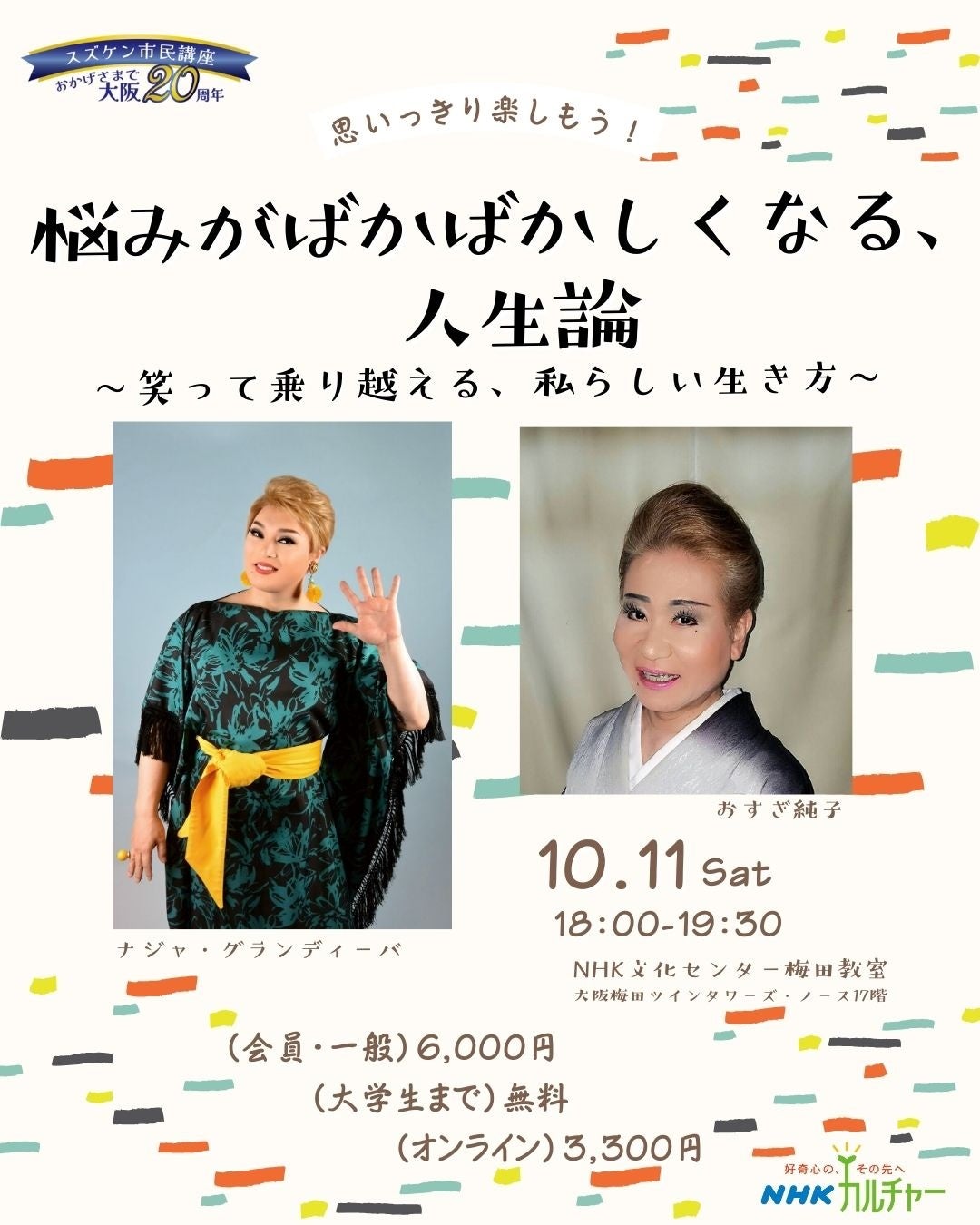NHK文化センター梅田教室では、2025年10月11日(土)に、スズケン市民講座の大阪開催20周年を記念して、ナジャ・グランディーバさんとおすぎママさんを講師に迎えた特別講座「悩みがばかばかしくなる、人生論~笑って乗り越える、私らしい生き方~」を開催します。