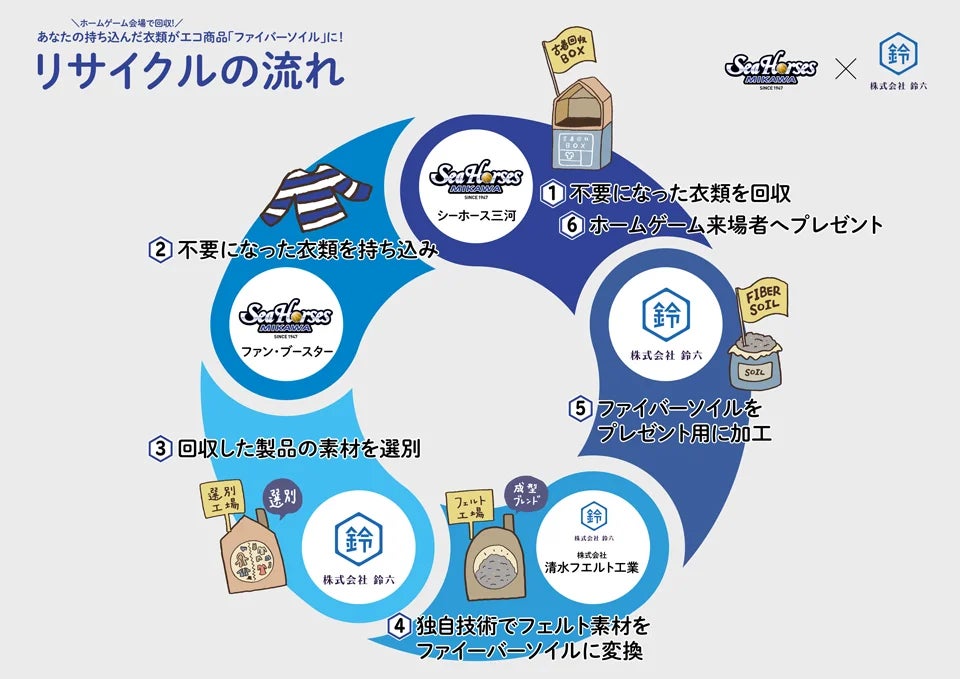 シーホース三河サスティナビリティプロジェクト「Be With」の一環として、株式会社鈴六のご支援のもと、ファンの皆さまやご来場者さまとともに古着のリサイクル率問題に向き合い、その解決に貢献するための活動を実施します。