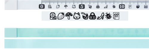 メジャーの目盛りには「テプラ」本体に搭載されている絵文字が印刷されています。メジャーの裏面はテープの裏紙の色を再現しました。