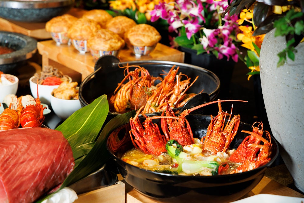 「天悠プレミアムディナービュッフェ」は、シェフが目の前で調理し、ライブキッチンならではの出来立ての料理をご提供いたします。数あるメニューの中でもおすすめは、脂がたっぷりのった「本まぐろの握り」や「国産牛のローストビーフ」に加え、伊勢海老をふんだんに使用した「伊勢海老の冷前菜」や「伊勢海老のブイヤベース」をご用意いたしました。