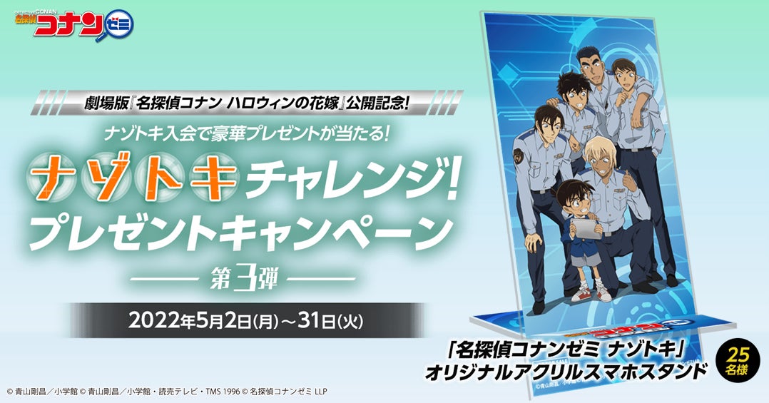 名探偵コナンゼミ有限責任事業組合は「名探偵コナンゼミ ナゾトキ」のサービス開始1周年を記念して、期間限定で「名探偵コナンゼミ ナゾトキ」が初⽉無料で遊べるキャンペーンを実施します。また2022年4⽉15⽇(⾦)公開の劇場版「名探偵コナン ハロウィンの花嫁」の公開を記念して、オリジナルグッズがあたる「ナゾトキチャレンジ! プレゼントキャンペーン」第3弾を開催することをお知らせいたします。