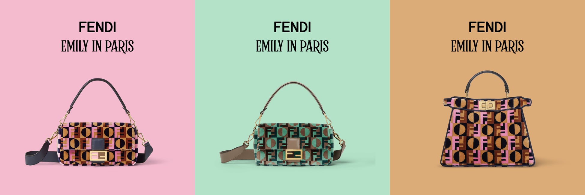 本コレクションは、パラマウント・テレビジョン・スタジオ(Paramount Television Studios)と、クリエーターのダーレン・スター(Darren Star)が手掛ける番組の、楽しく洗練されたスピリットを表現しています。その精神を捉えて特別にデザインされたのは、フェンディのアイコンである「バゲット(Baguette)」バッグ2型と「ピーカブー(Peekaboo)」バッグ1型となり、アイコニックな「FF」ロゴとアールデコ調の水玉模様を融合させた「フェンディ ドット(FENDI Dots)」モチーフが特徴です。美しいタペストリー効果のある生地で仕立てられ、ブラウンとピンク、またはダブとミントグリーンのカラーパレットの組み合わせが際立っています。